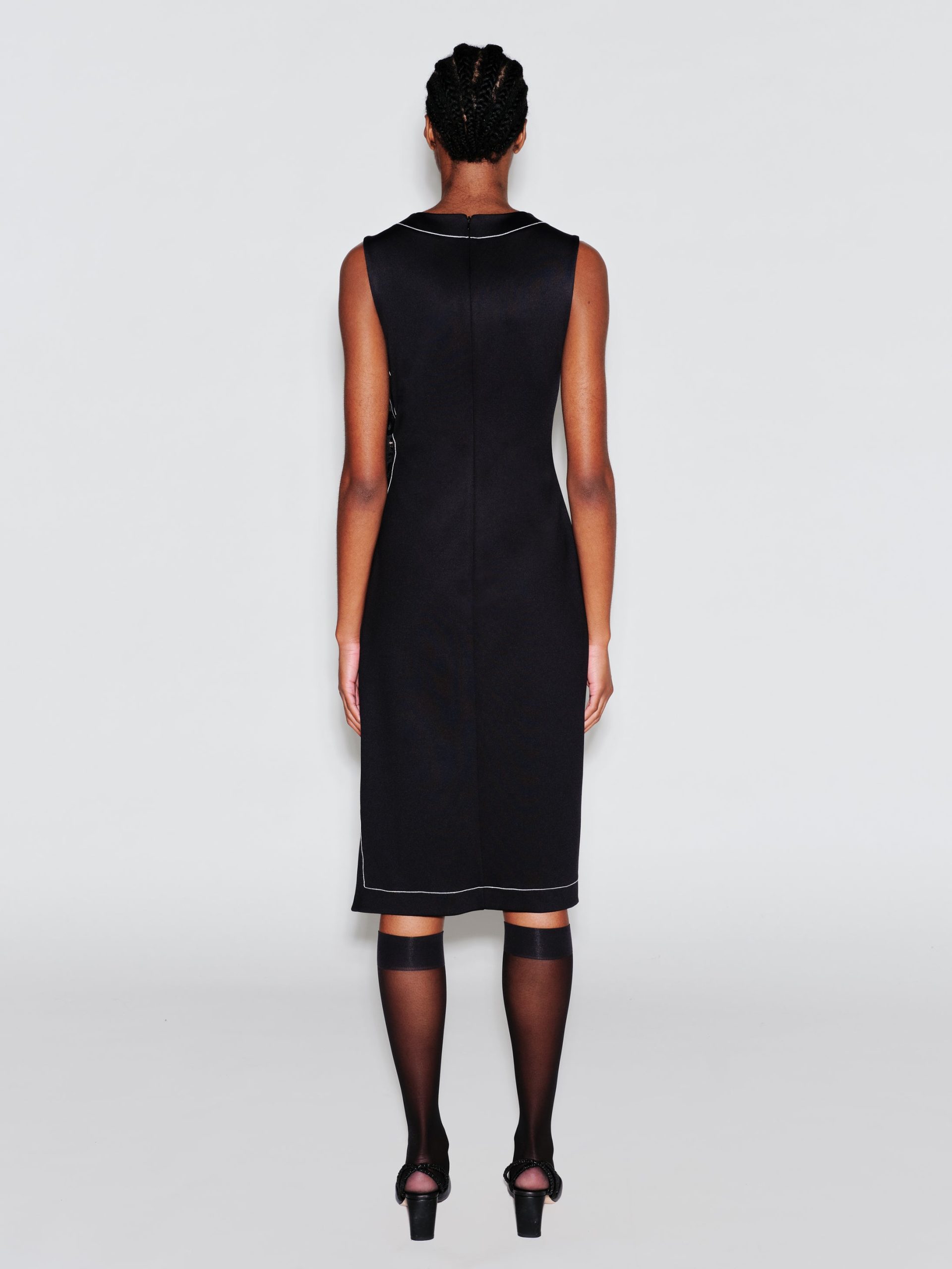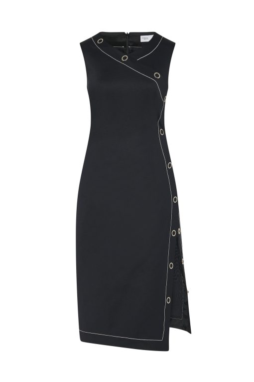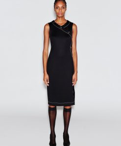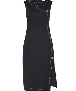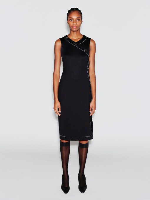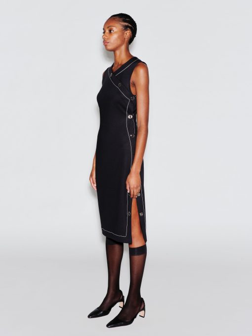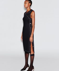 Crafted of Scuba Doubleknit, a sleek fabrication with a matte-shine finish, Rosetta Getty’s new midi dress is cut with asymmetric shaping. Elevated by contrast topstitching, it features the season’s ring-snaps up the side and across the bust, enhancing the body-conscious shape whilst allowing for adjustable wear.