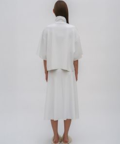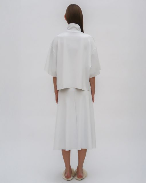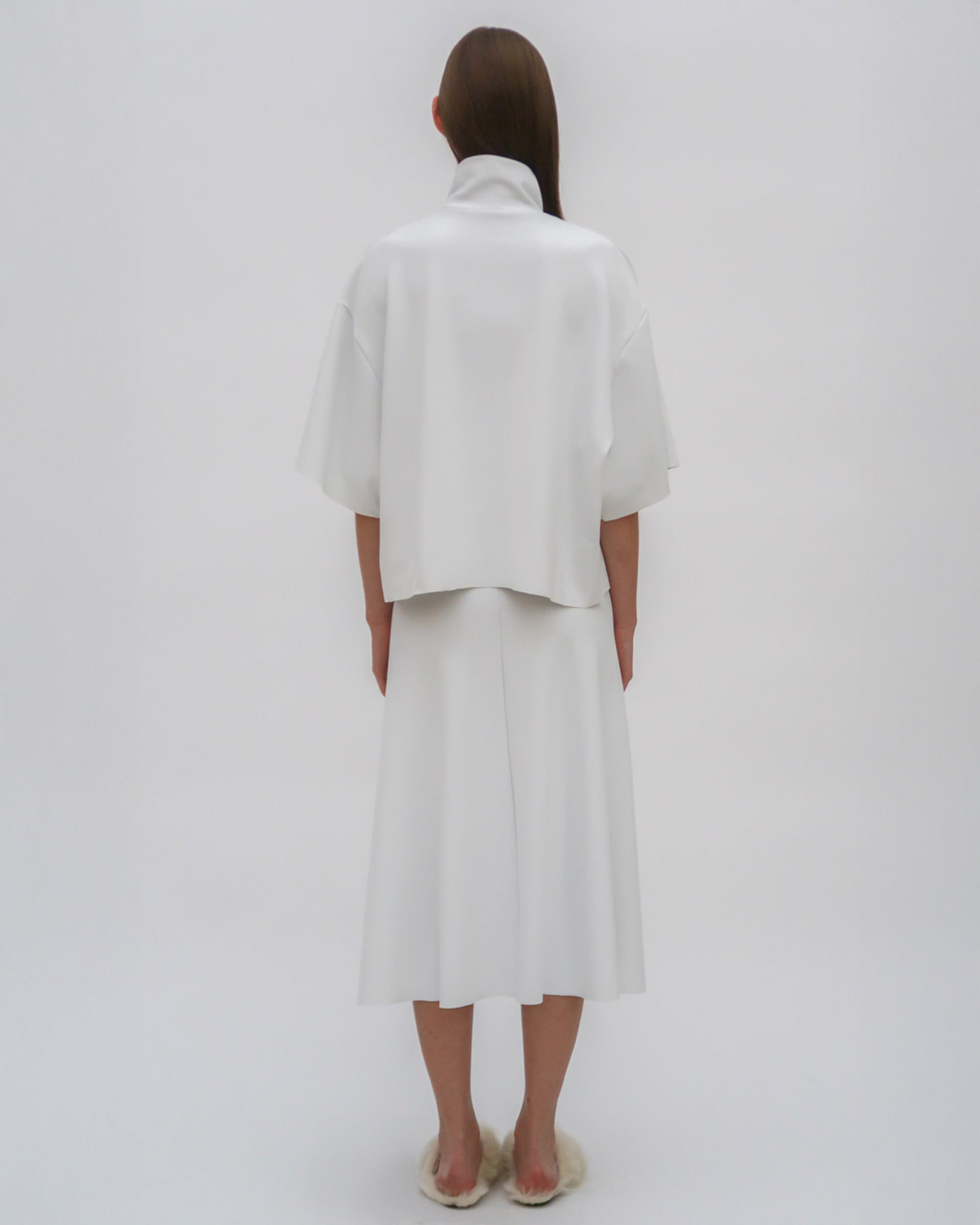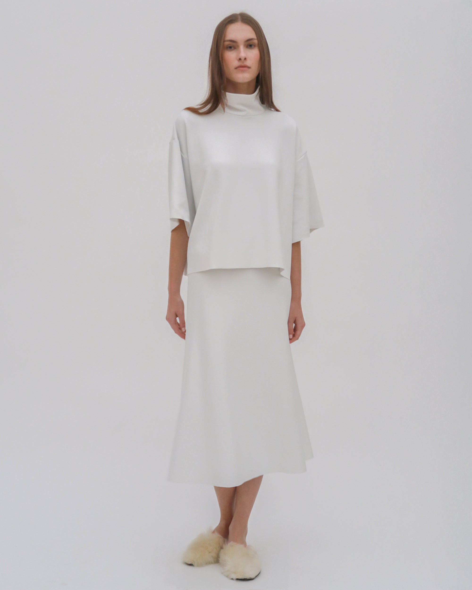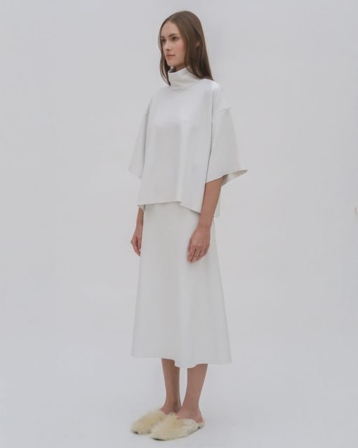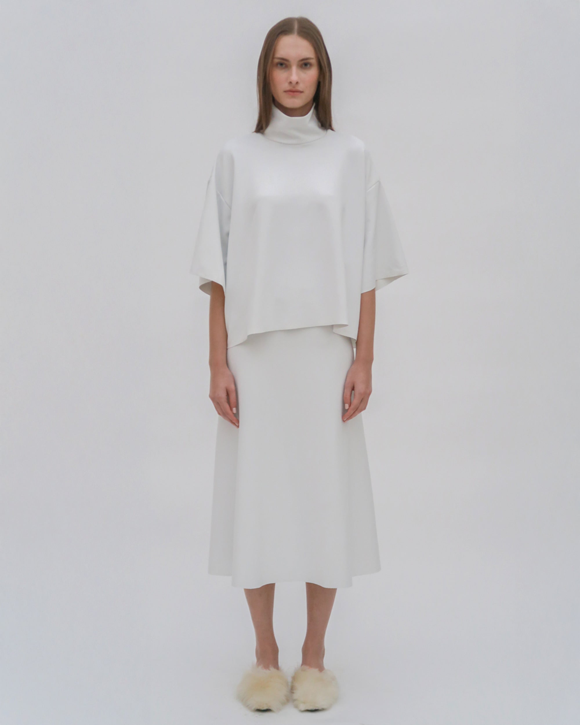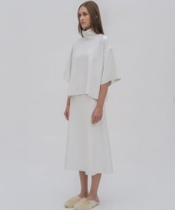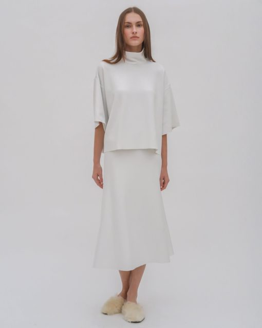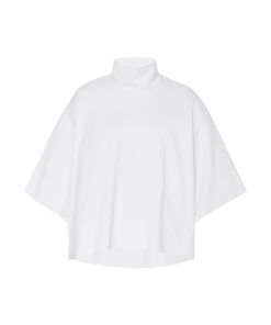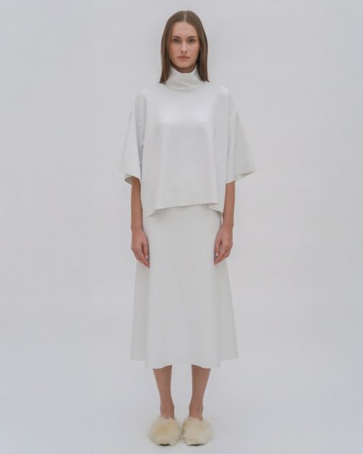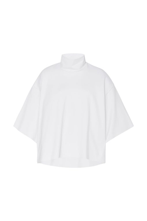 The Boxy Turtleneck Top is a perfect addition to the Resort 25 collection. Designed with a slightly cropped silhouette and raw hems, it has a sense of movement with a modern and streamlined look that pairs well with other styles from the season.