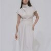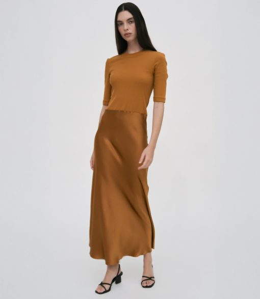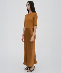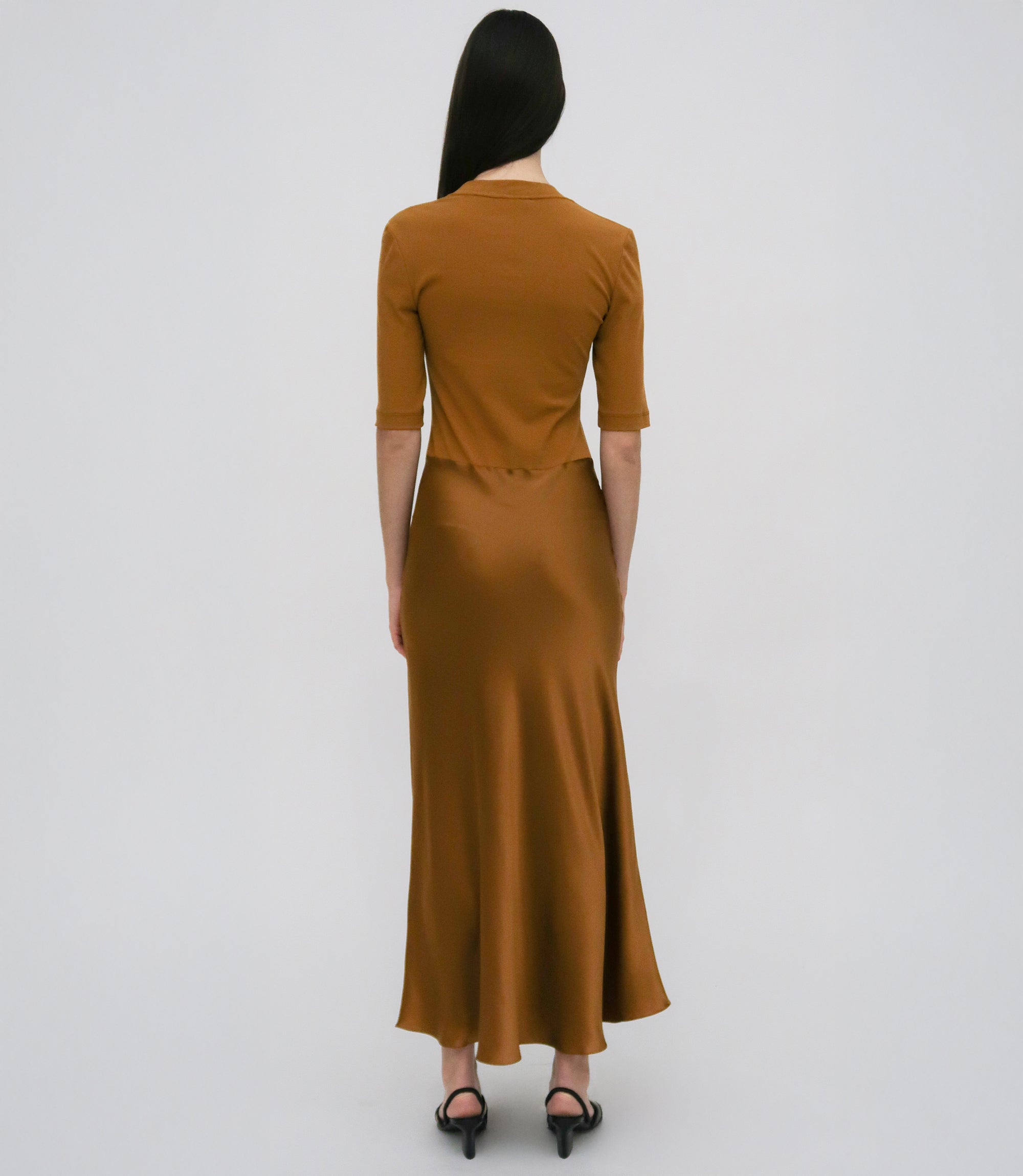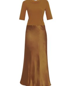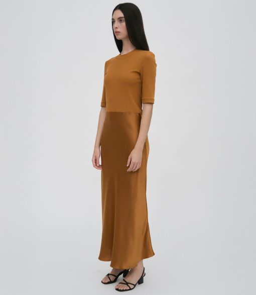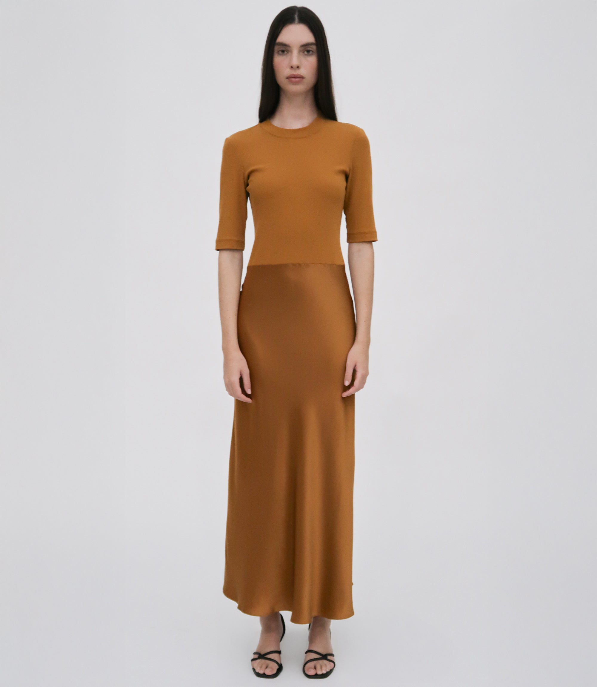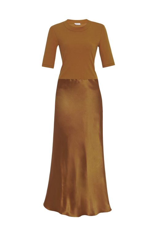 An exciting addition to the favorite Mercerized Cotton Rib Jersey capsule, the Combo T-Shirt Dress elevates the now classic Cropped Sleeve T-Shirt. Featuring an attached bias-cut midi skirt in luxe Silk Satin, it offers unexpected comfort and ease whilst being inherently elegant and refined.