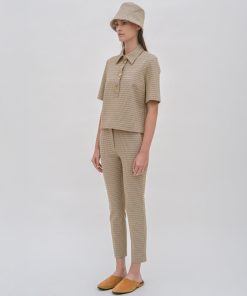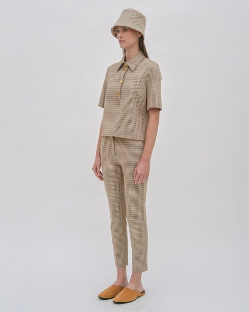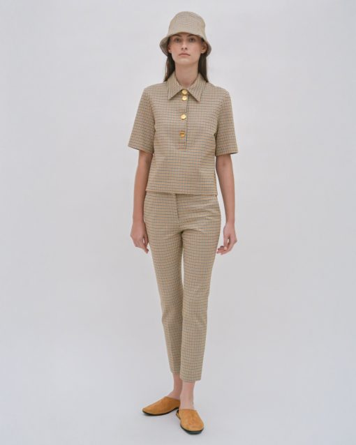 An exclusive fabrication for the season, the Houndstooth Plaid Interlock Jacquard is similar to our Interlock Jersey, which has a slightly slick hand and added elastic to contour the body. It’s produced by an Italian mill certified for its sustainable practices by the Associazione Tessile e Salute (Health and Textiles Association) and Forest Stewardship Council (FSC), which uses viscose produced using sustainably sourced and certified FSC wood pulp.
