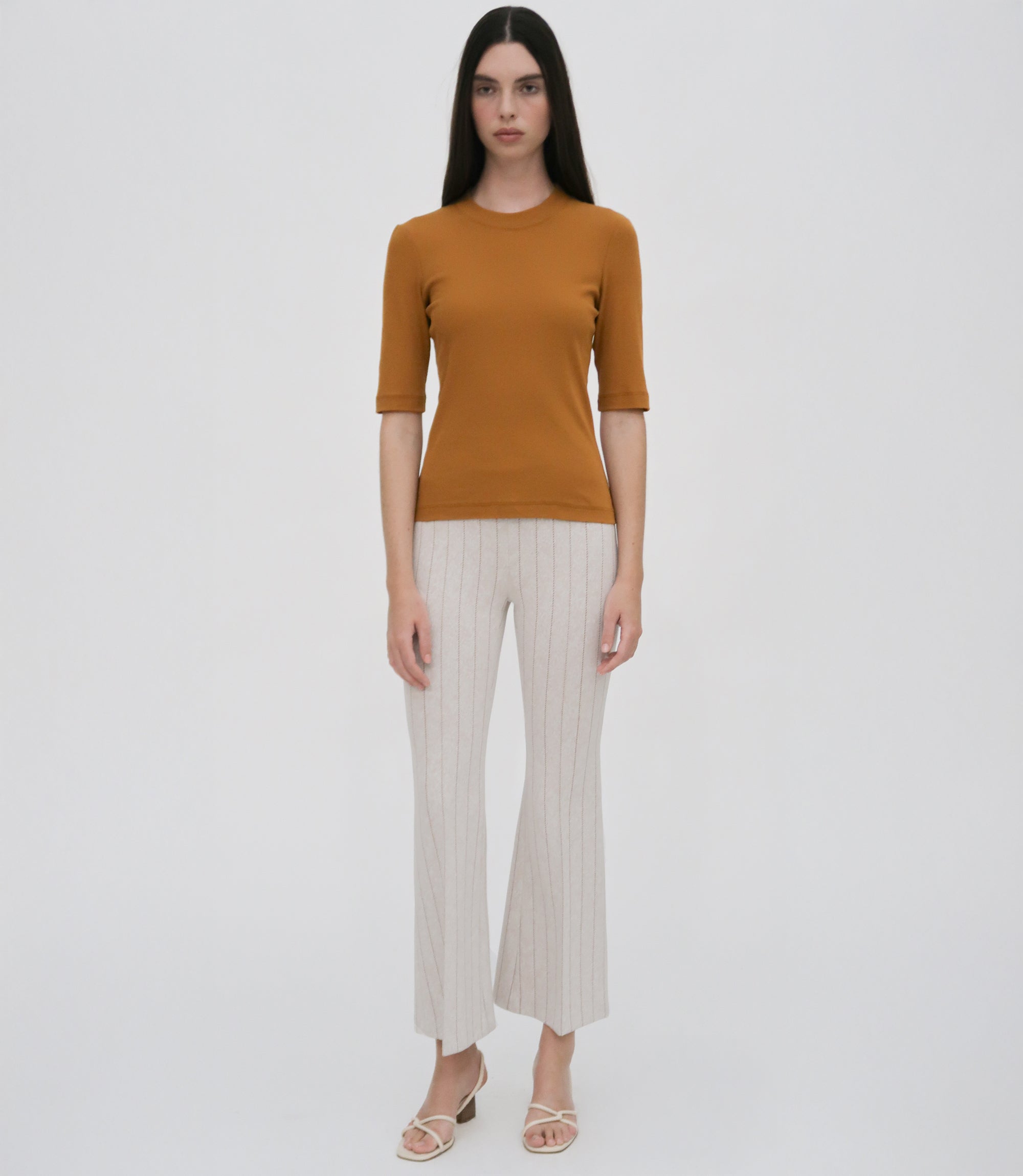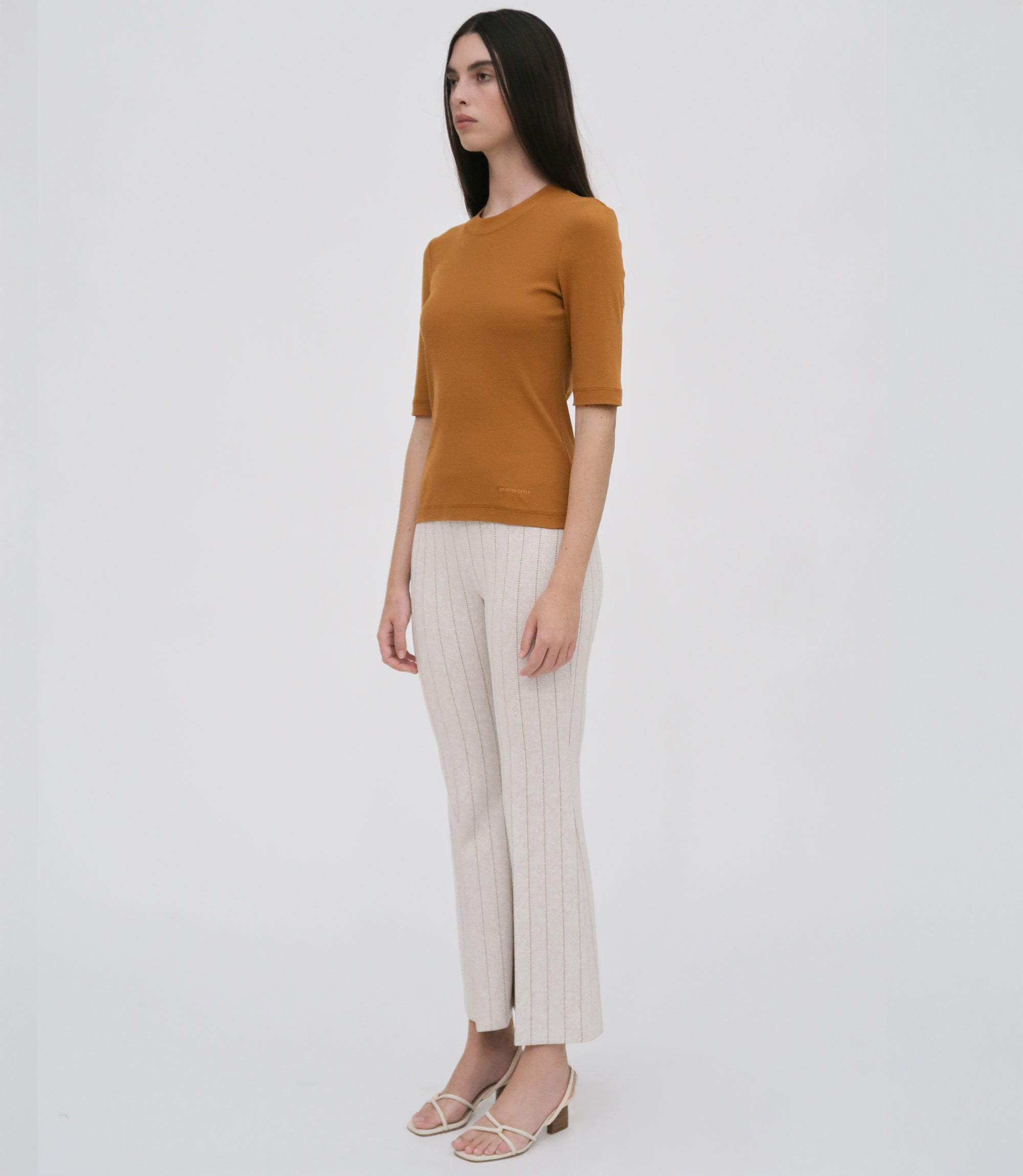 Signature Mercerized Cotton Jersey adds sophisticated softness to this flattering style, an elevated version of the wardrobe-essential crewneck T-shirt. Cut close to the body, it has a versatile silhouette with fitted sleeves that hit just above the elbow.