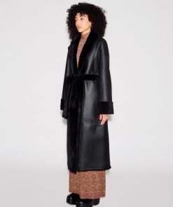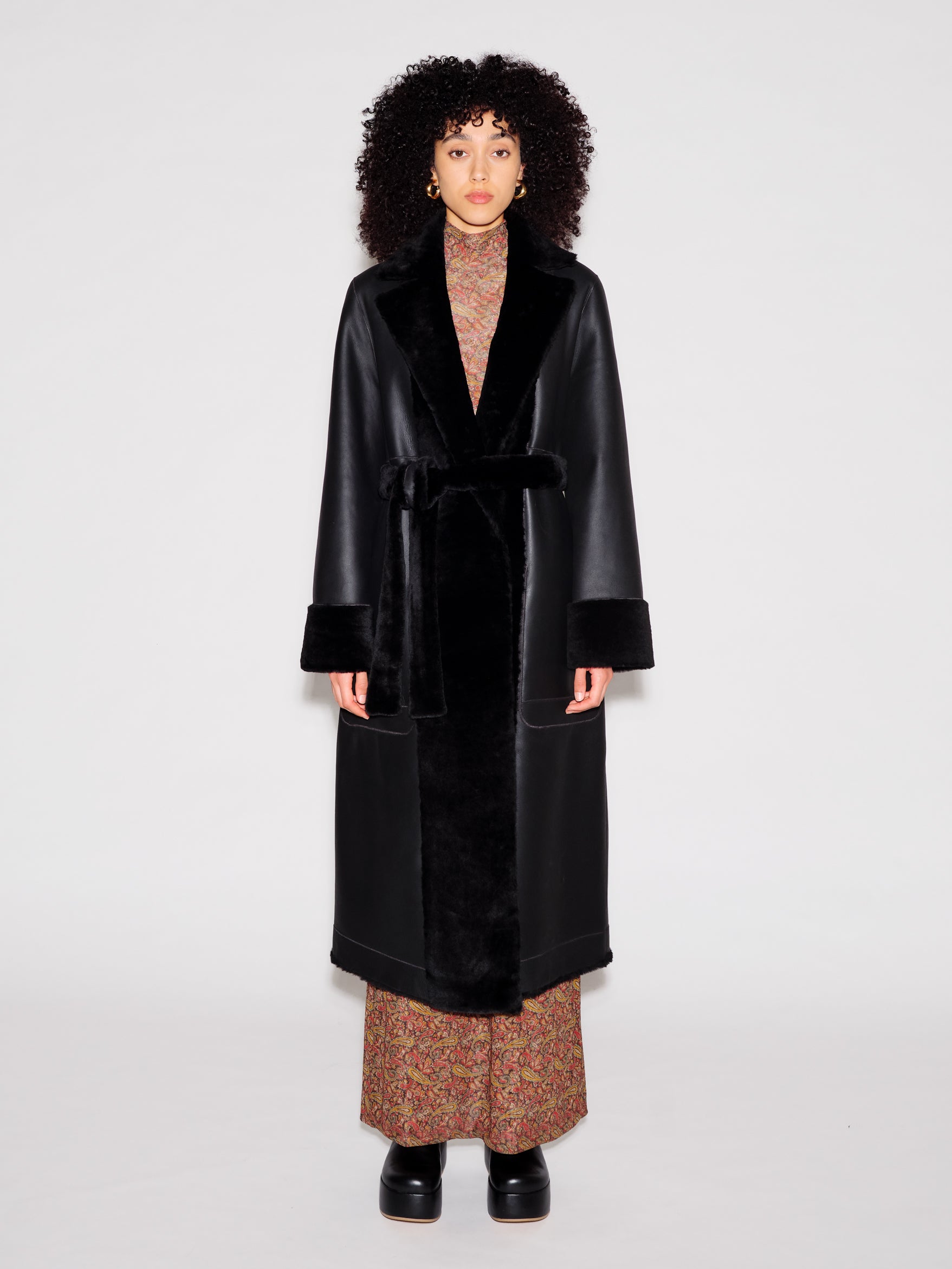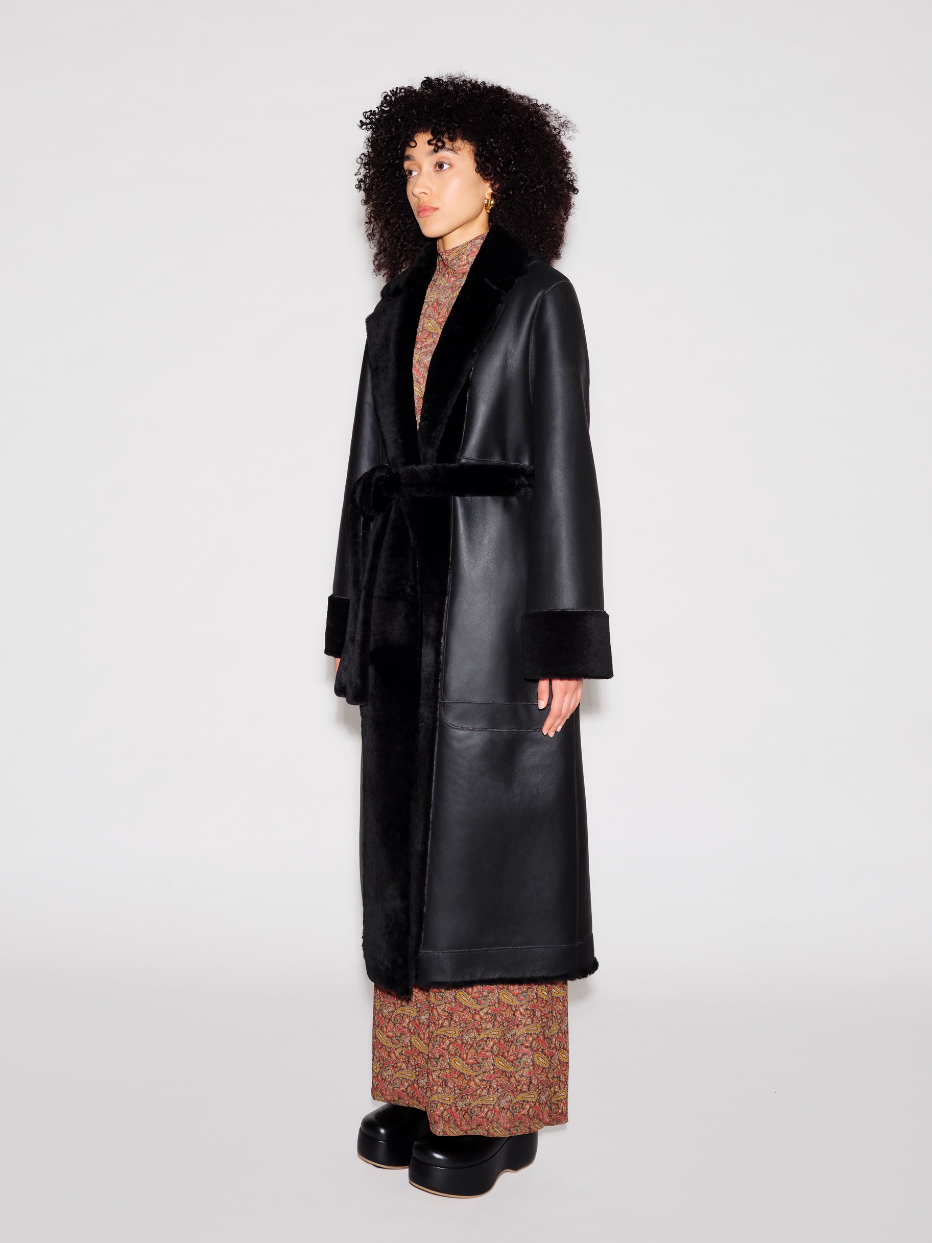 Crafted of plush shearling, our luxe coat is a cold-weather dream: it is fully reversible from fur to leather for convertible wear. Cut to an oversized double-breasted silhouette, it hits at the mid-calf and features a self-tie belt for a cozy fit.