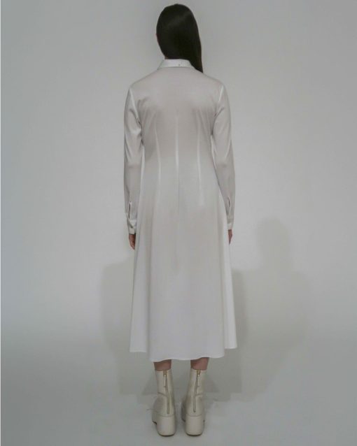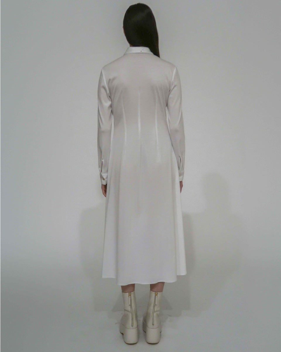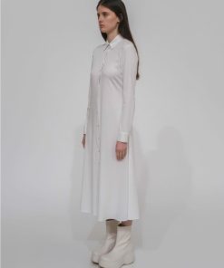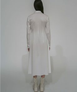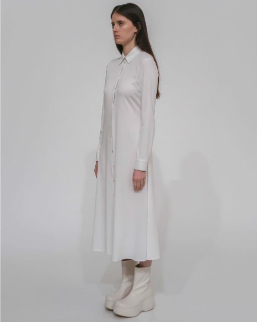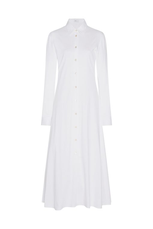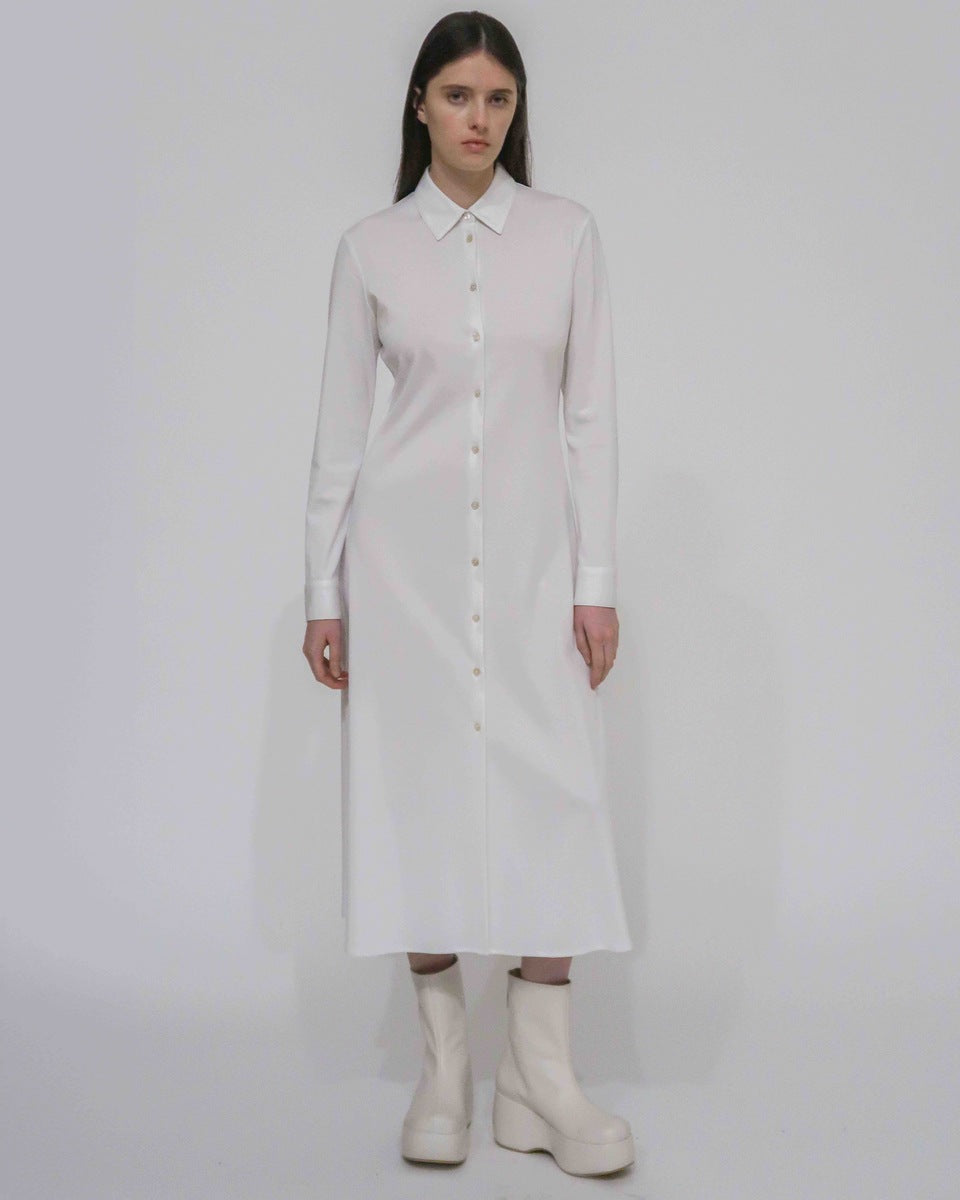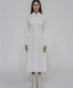 Reimagining the archetypal shirtdress, Fall 24’s version is tailored to a fit & flare silhouette. Cut in the heavier-weight Icy Cotton Rib Jersey, the style has soft structure and a polished finish to complement its refined and minimalist look.