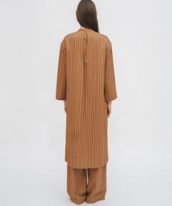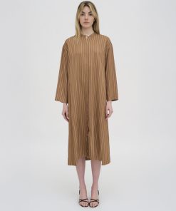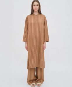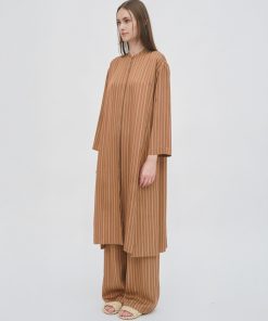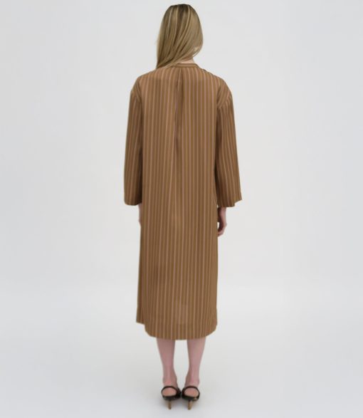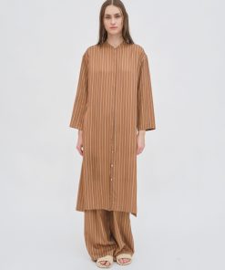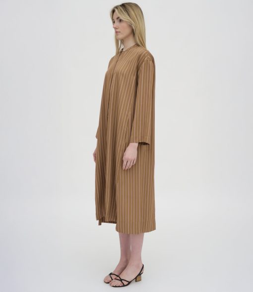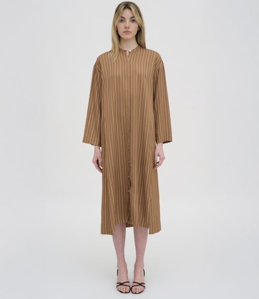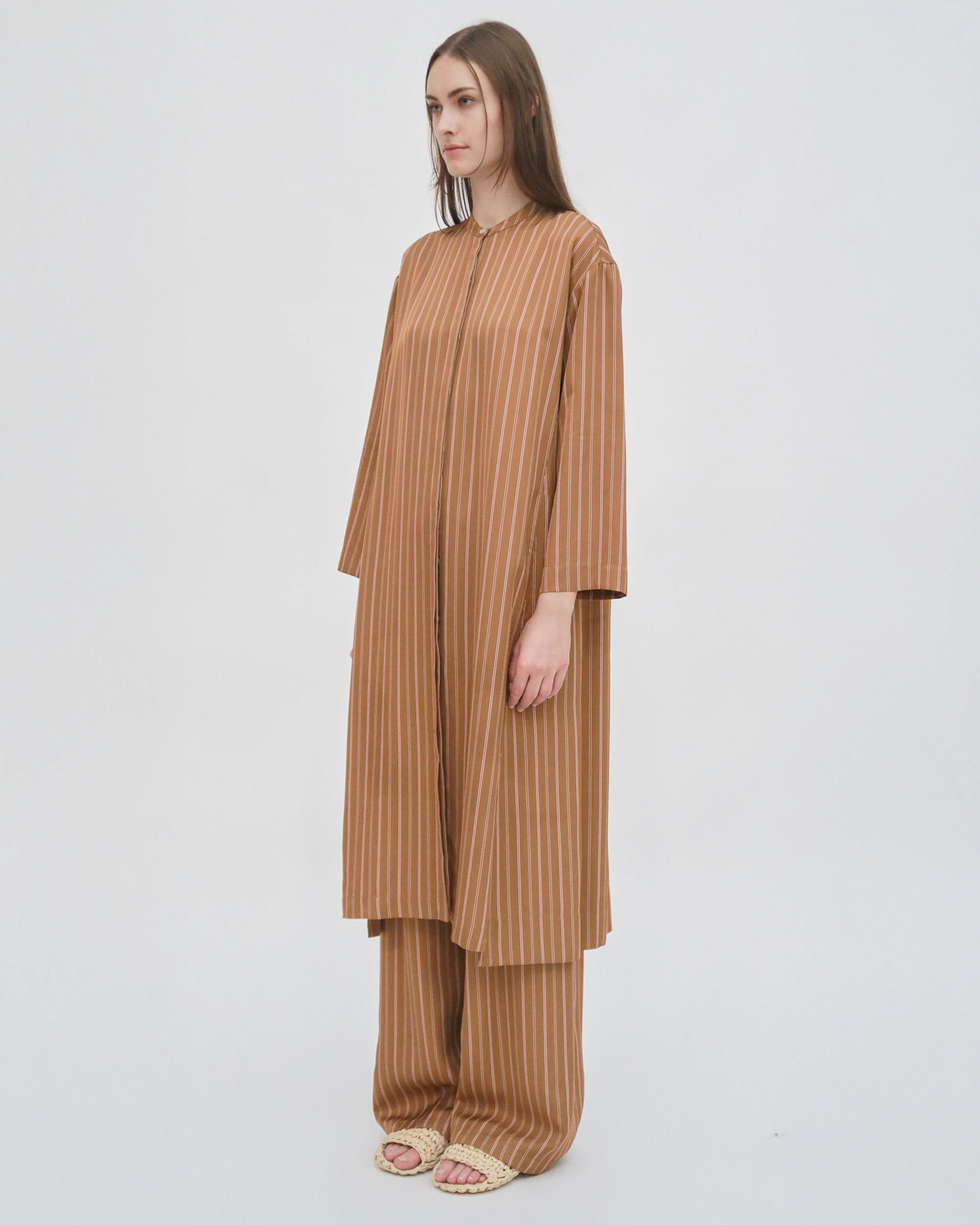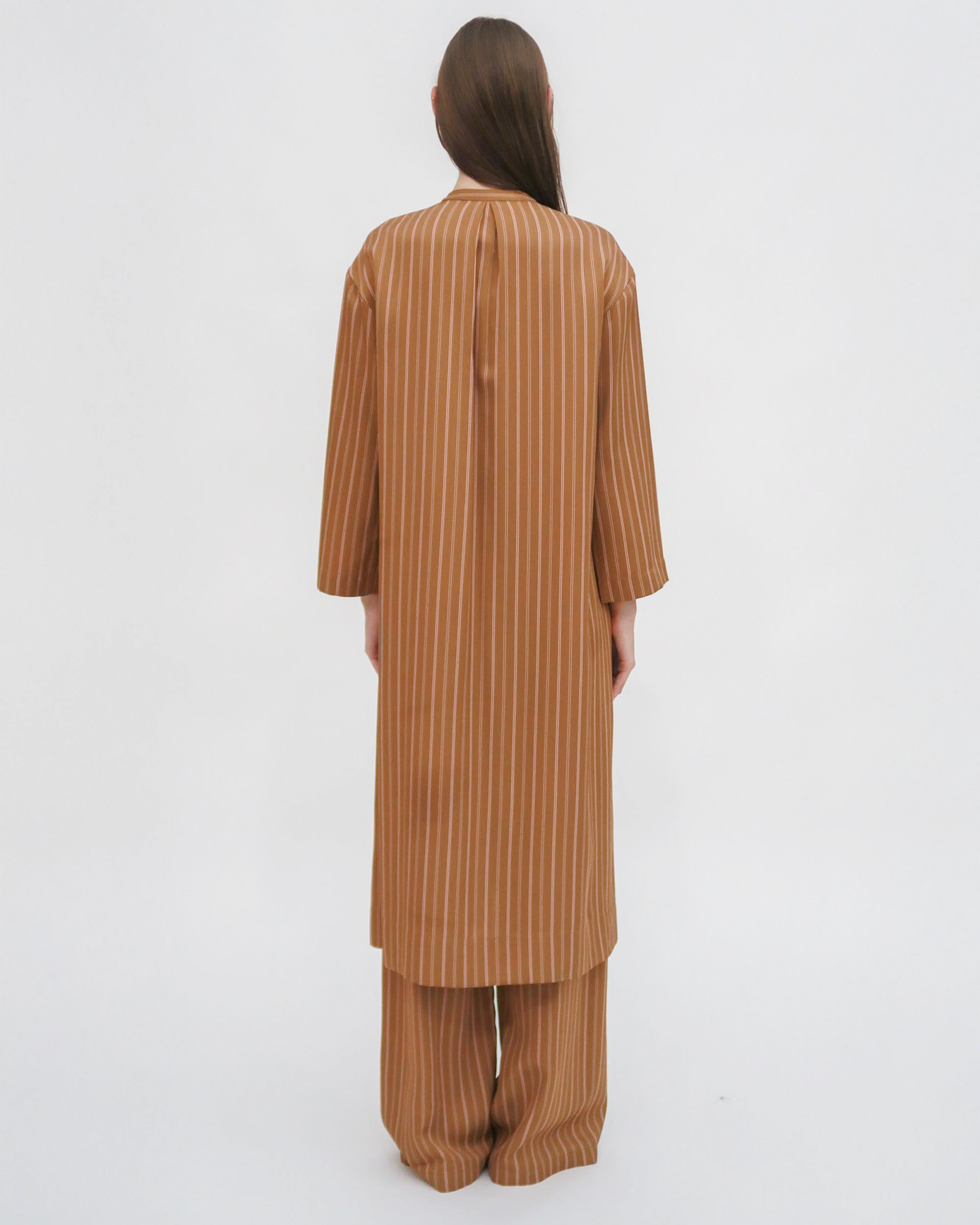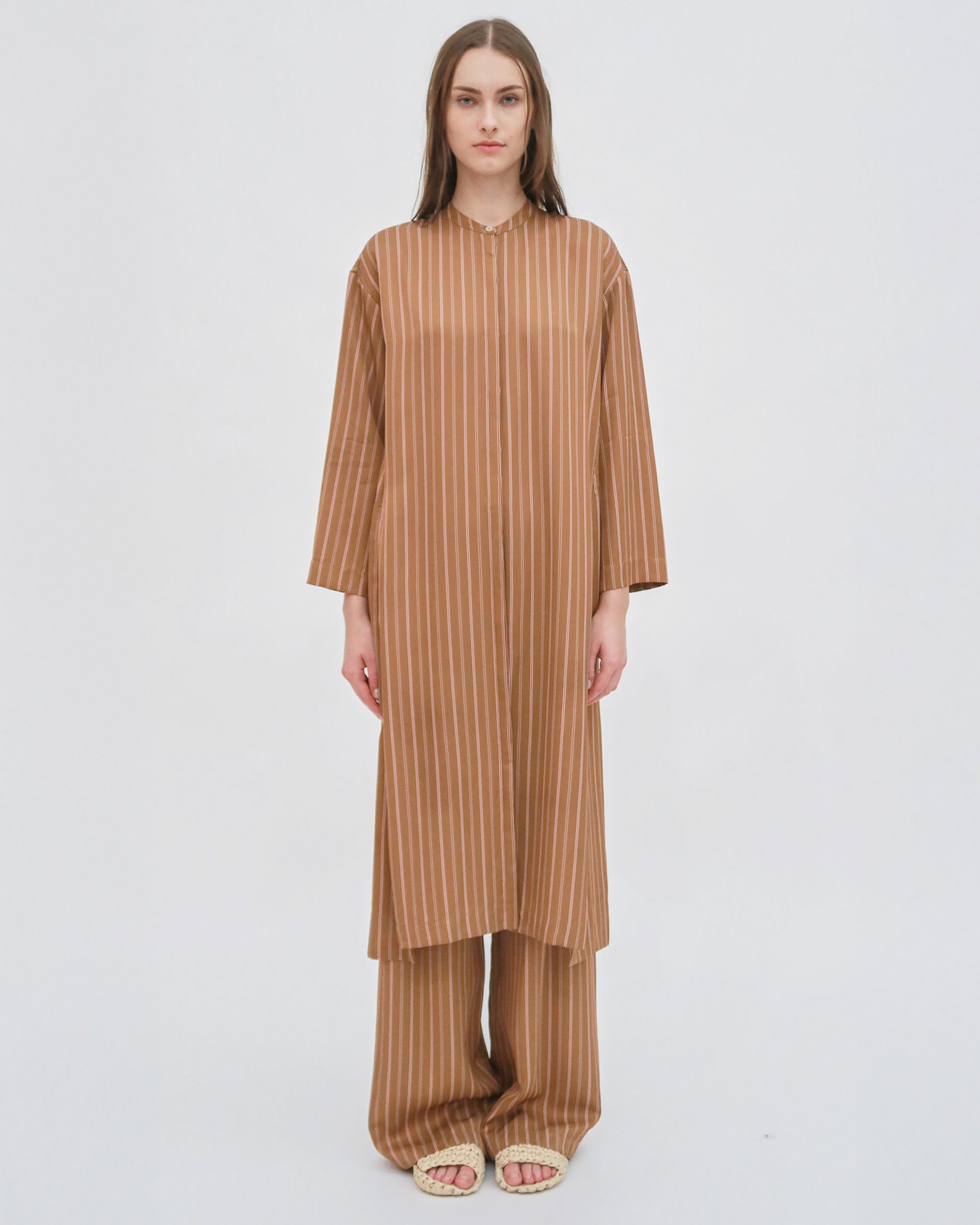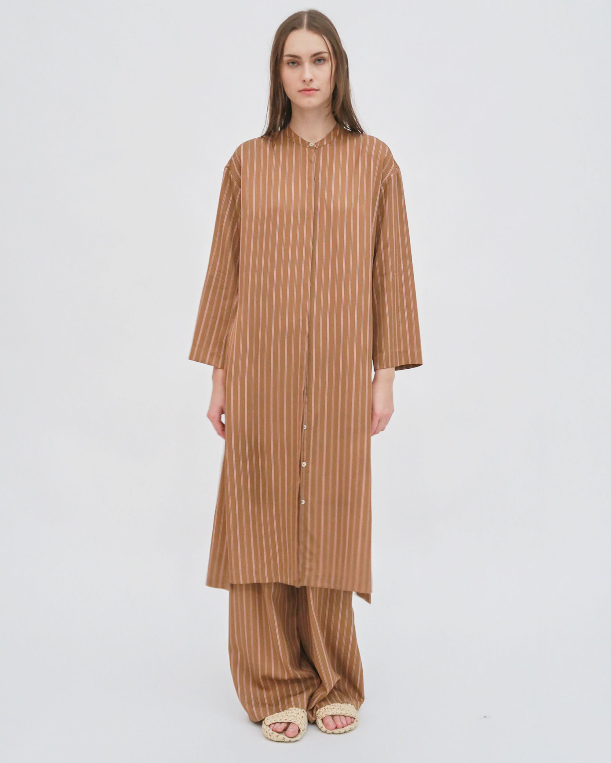 The Long-Sleeve Caftan Shirtdress is sophisticated and simple, an archetypal style that transcends time and culture. It can be worn open or closed, layered over the matching pants or on its own, with the new Fluid Stripe Viscose a substantial crisp twill that lends structure to the style.
