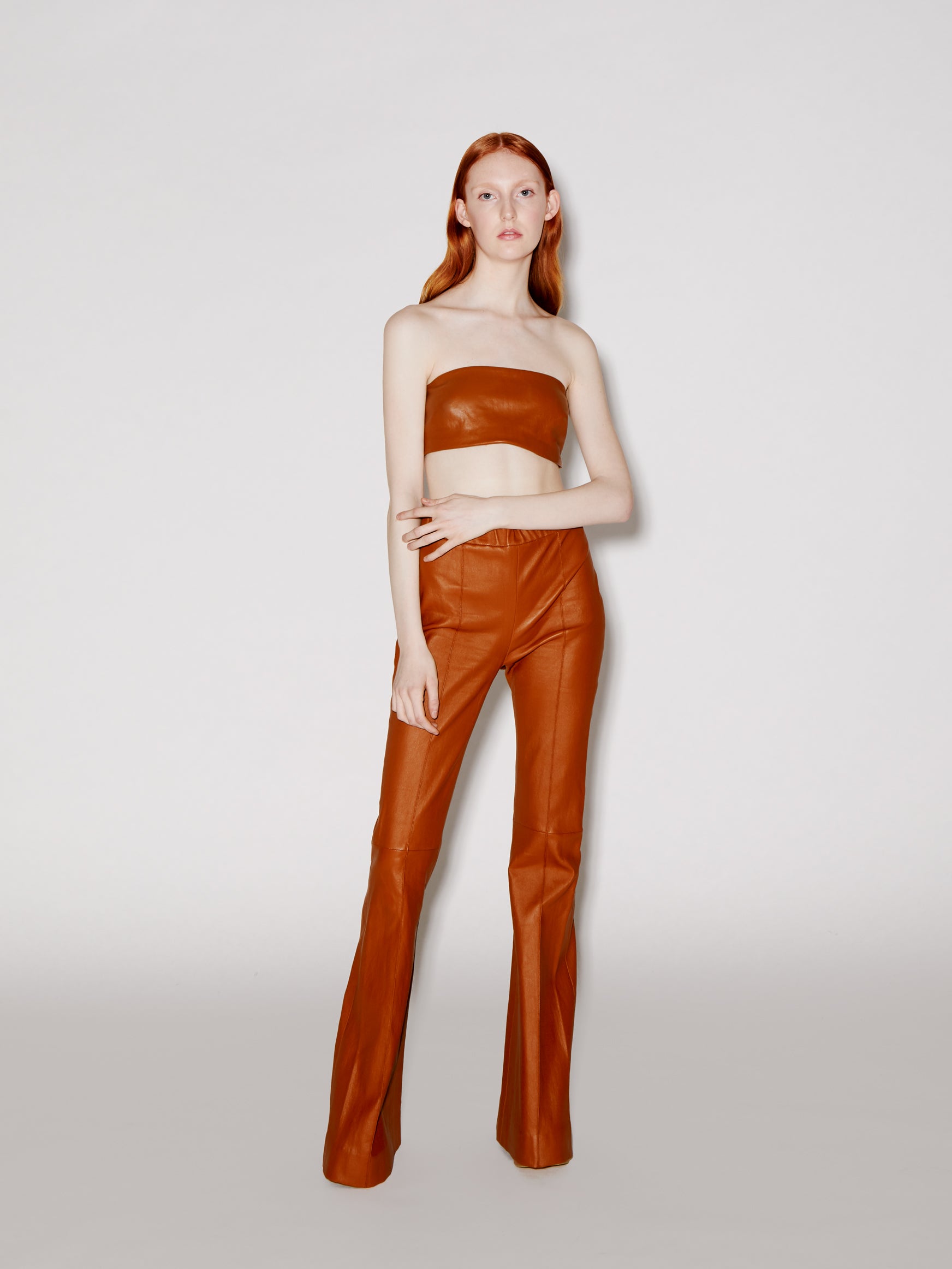 Designed to flatter and elongate the body, this ultra-soft leather pant has a mid-rise, flared leg silhouette. Pintuck seaming down the front lengthens further, while the elasticized waist enhances the ease of wear.