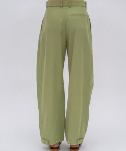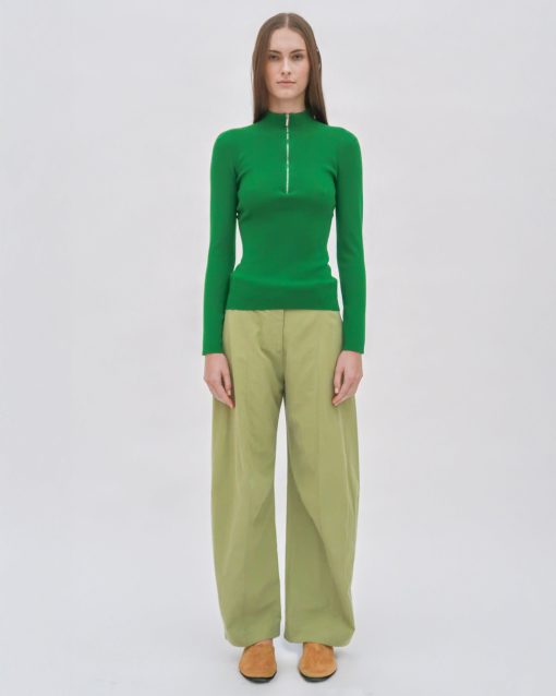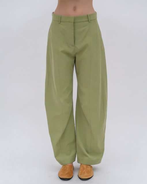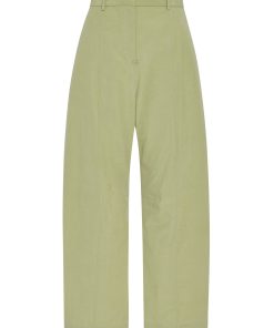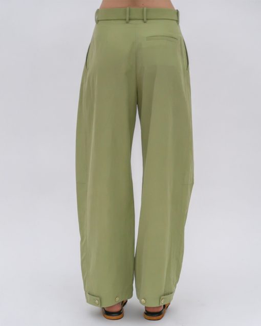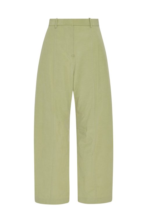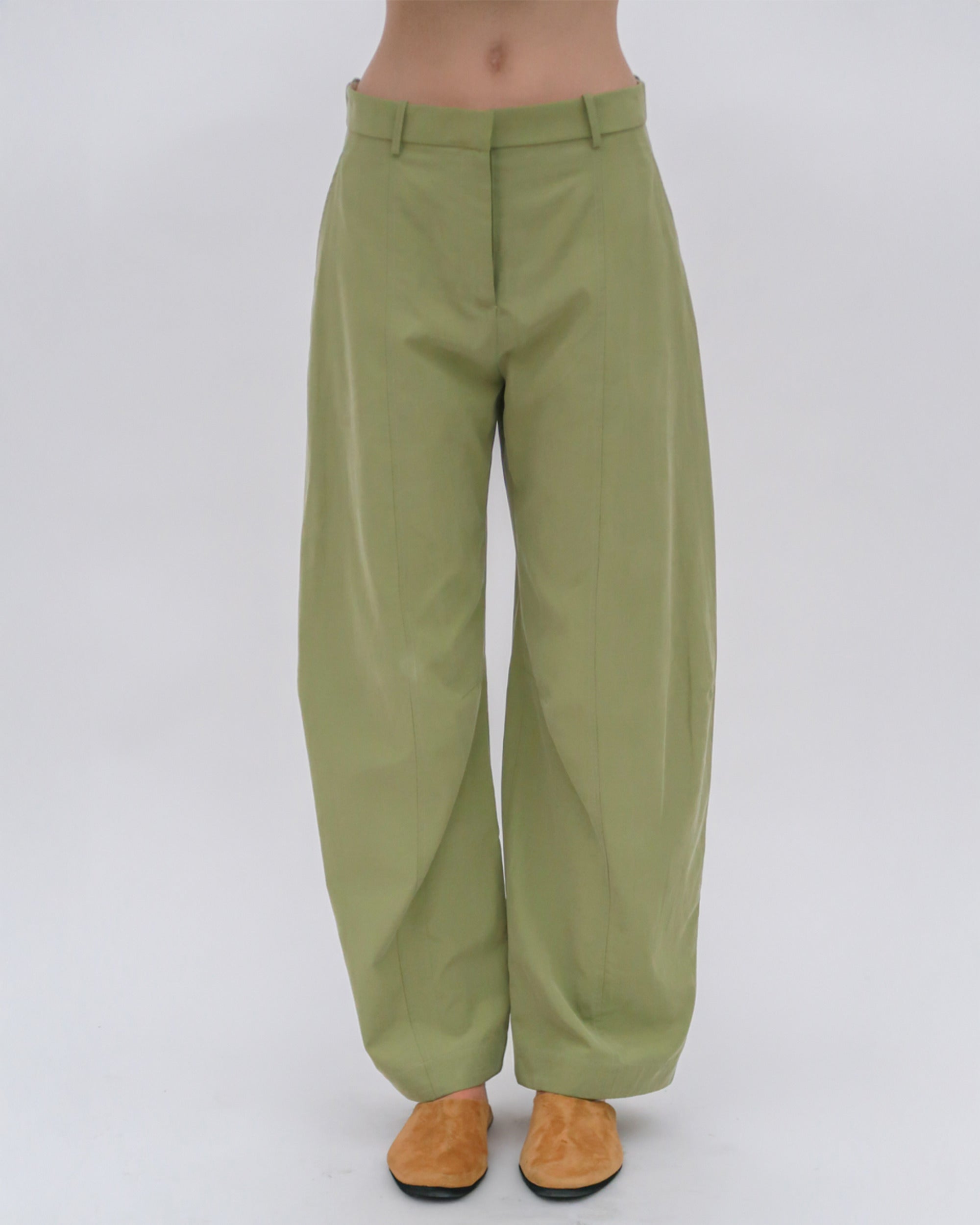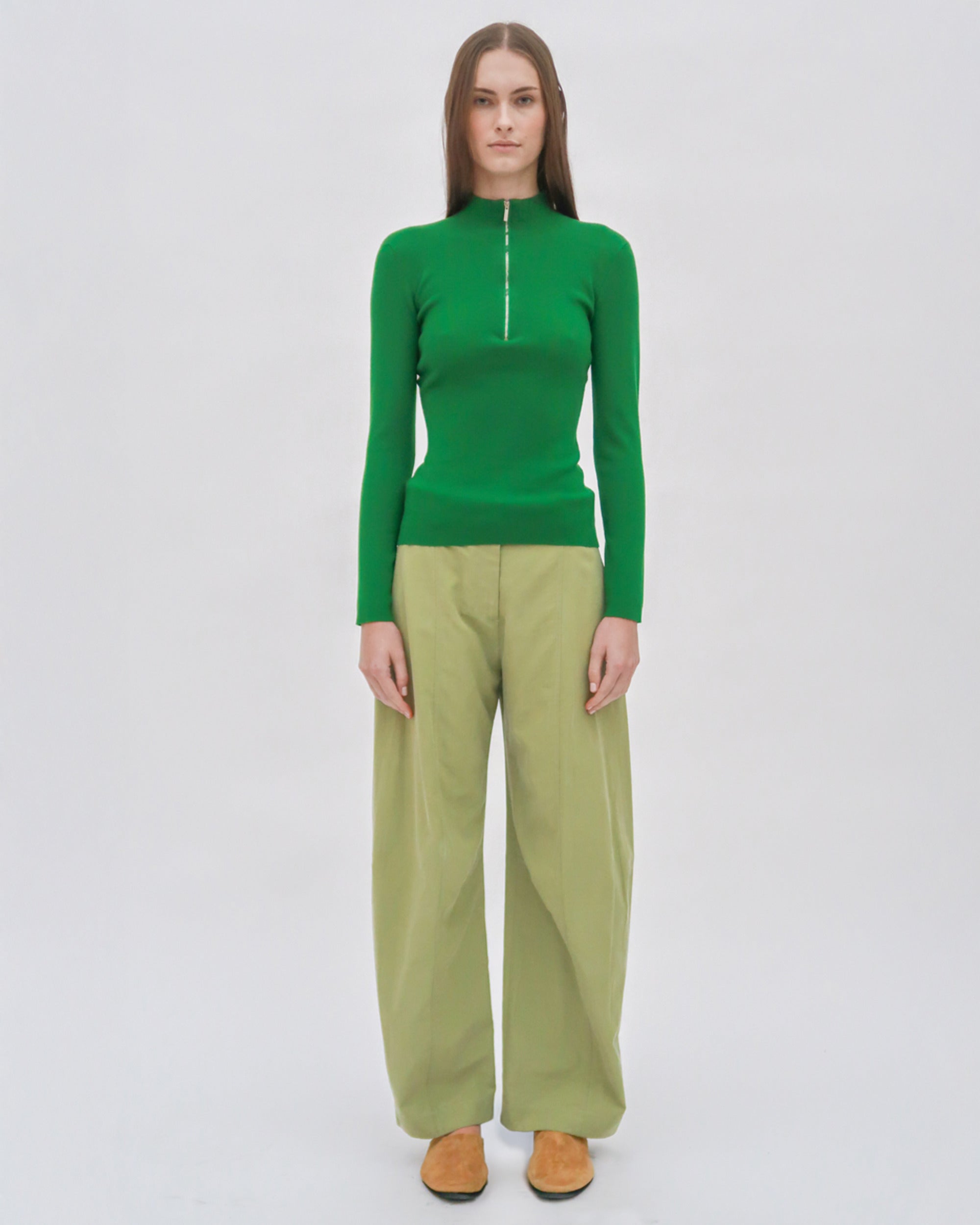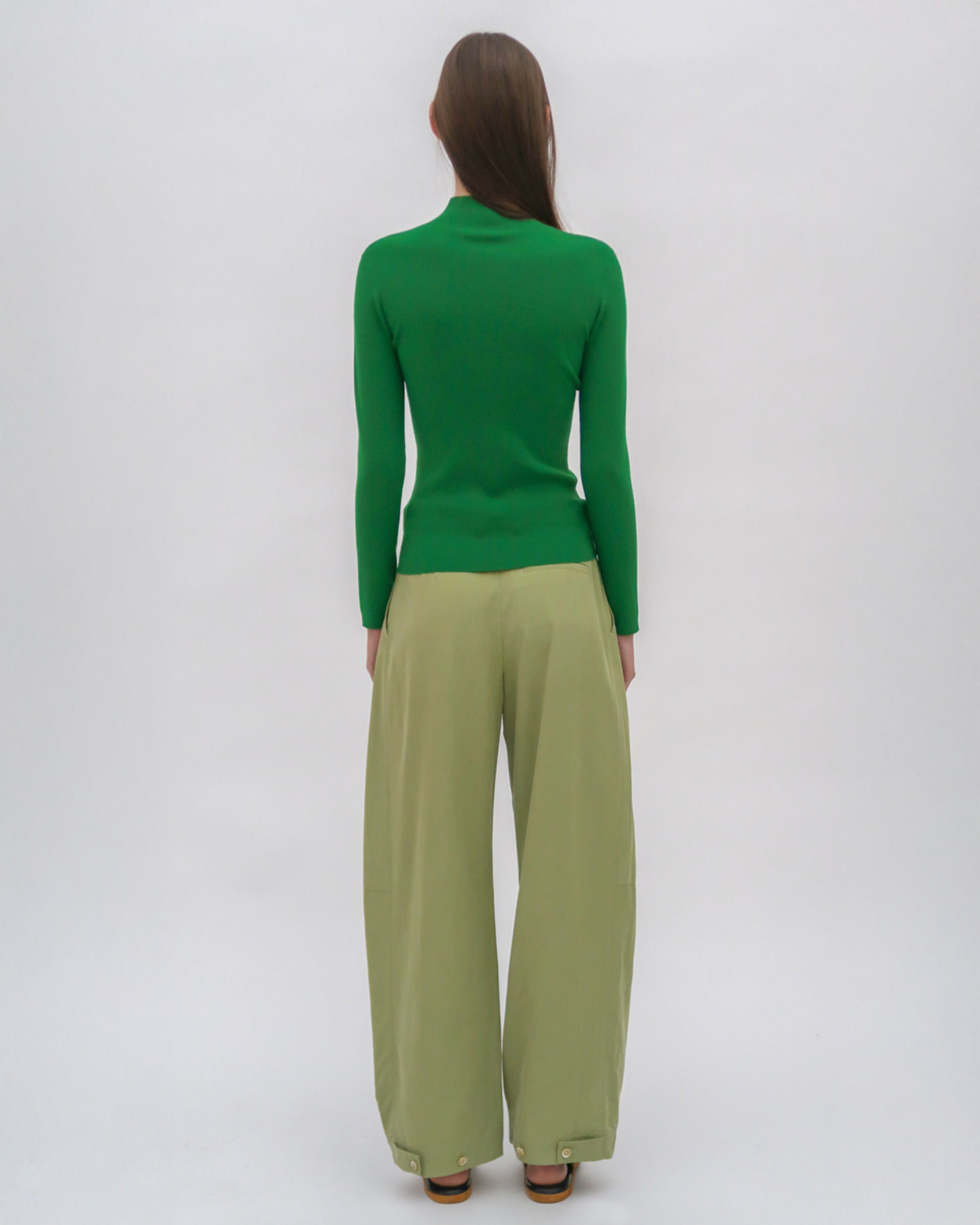 Resort 25’s key pant silhouette is chic in our new Fluid Poplin fabrication, anchored in one of the season’s many shades of green. A satiny finish lends ease to the straight-leg style, designed with refined tailored details and shaped with tiny darts at each knee. The button-tab hem allows transition between a classic slack and harem-like trouser.