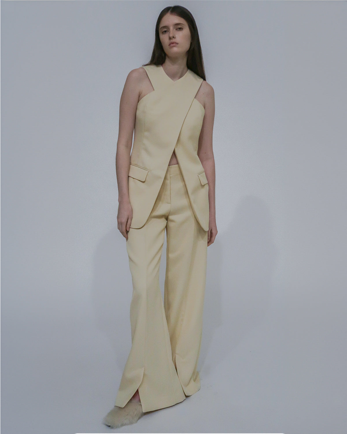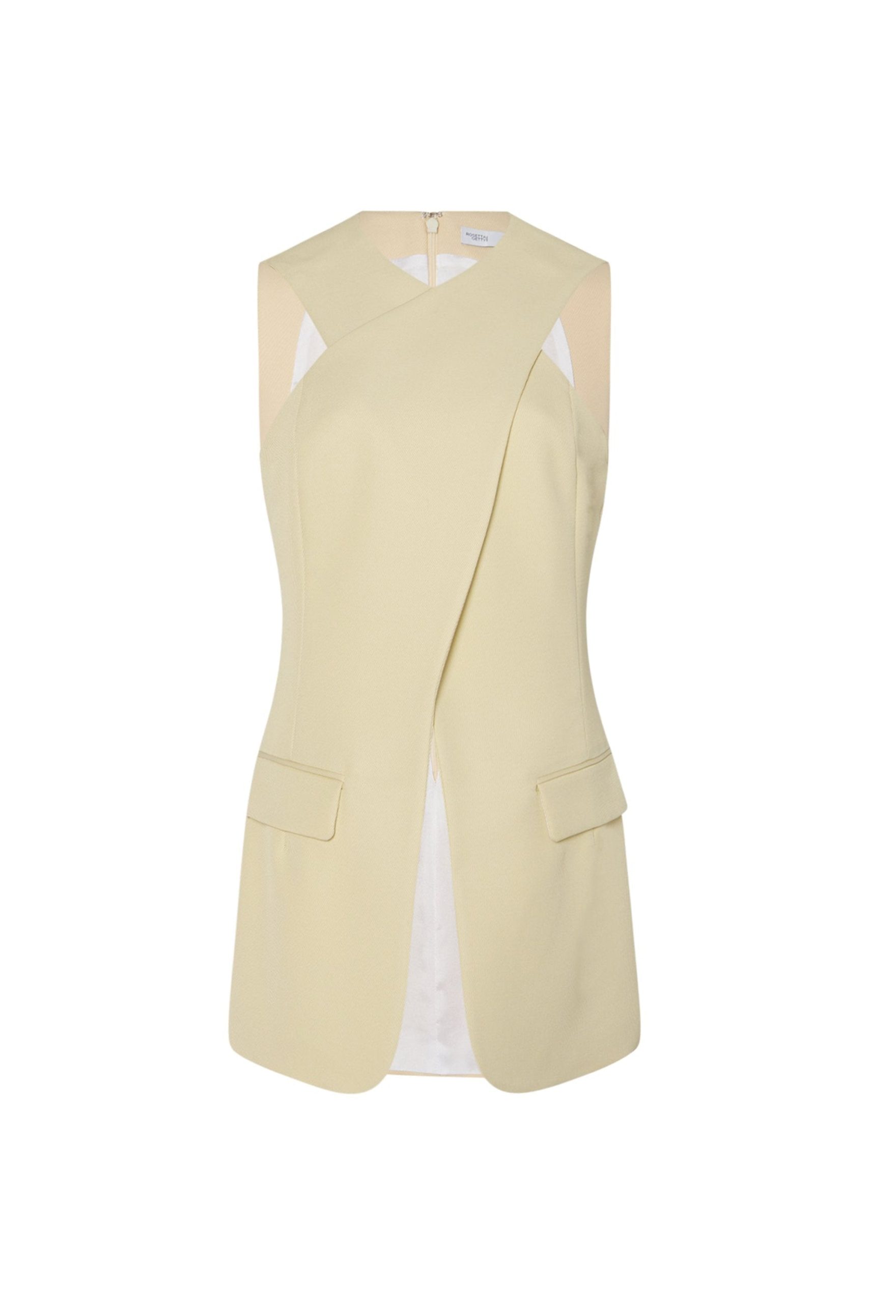 Our latest silhouette in a comprehensive and creative suiting wardrobe, the Tailored Cross-Front Top extracts the defining characteristics of tailoring and imagines them anew. Crafted of Wool Viscose Twill Suiting, the modern style is cut in a longer fit that crosses at the bust.