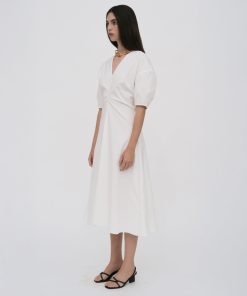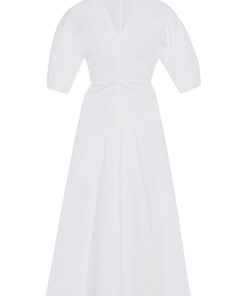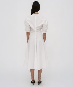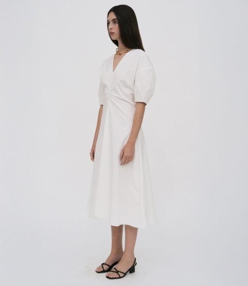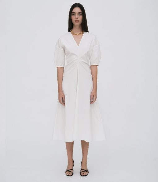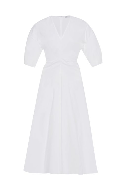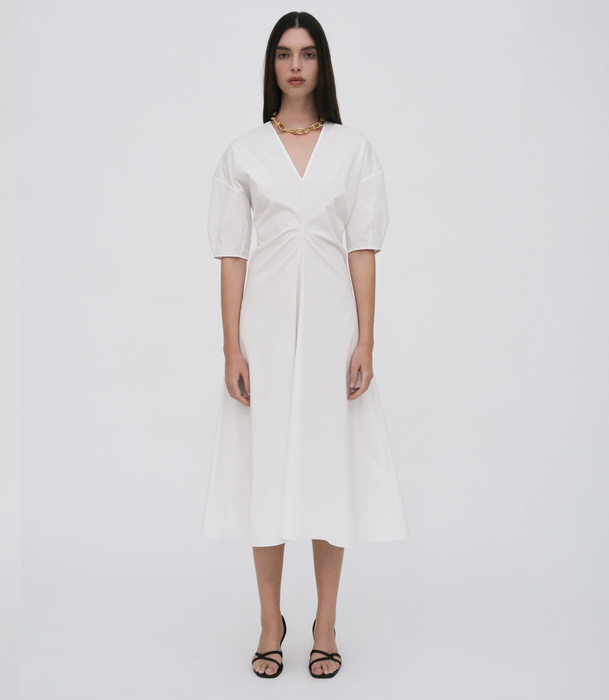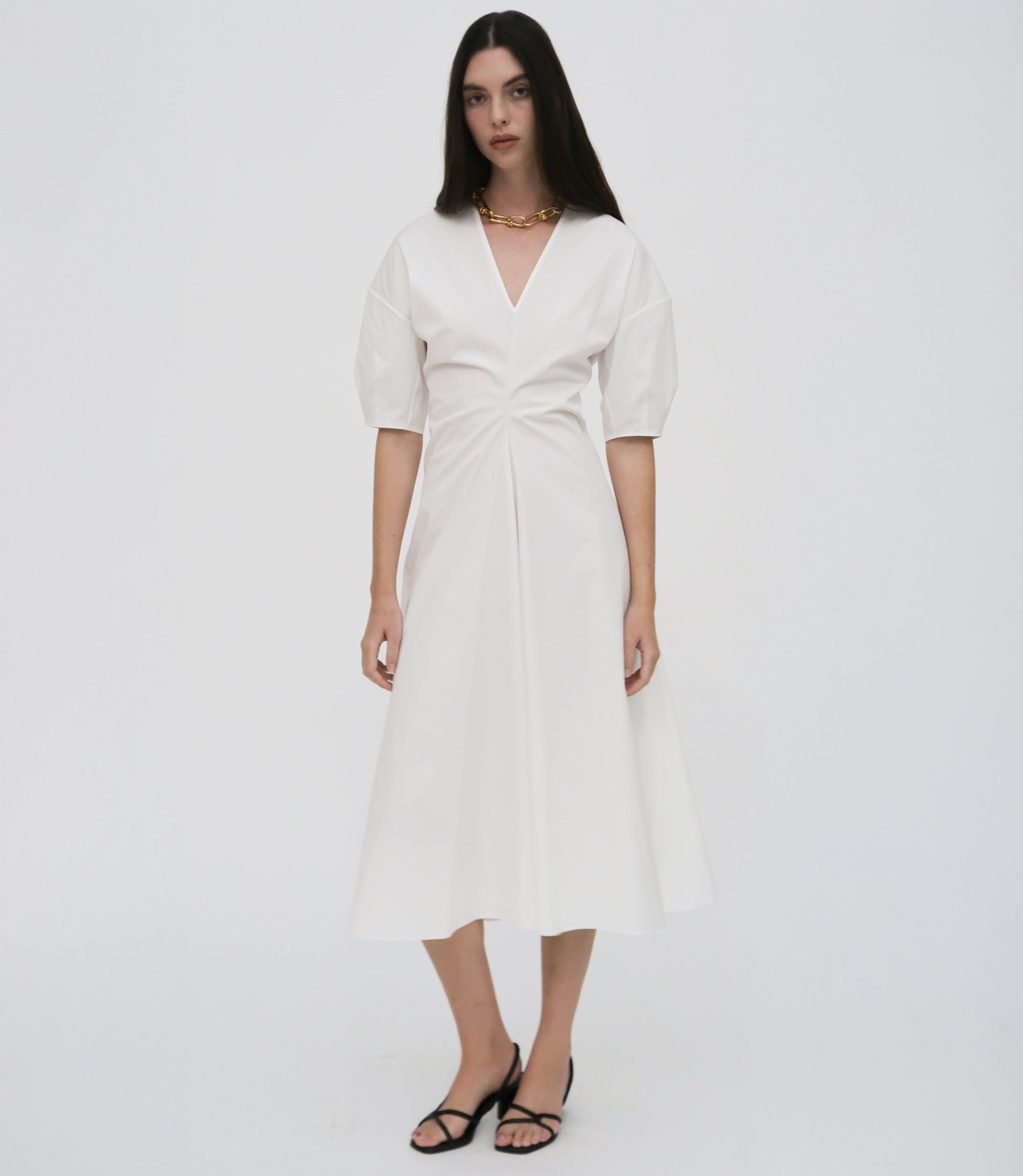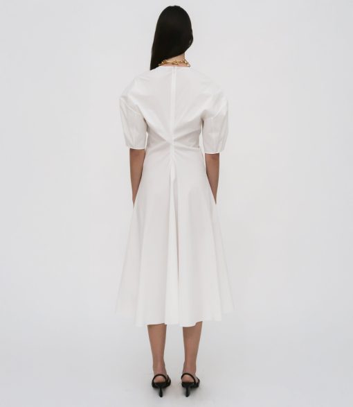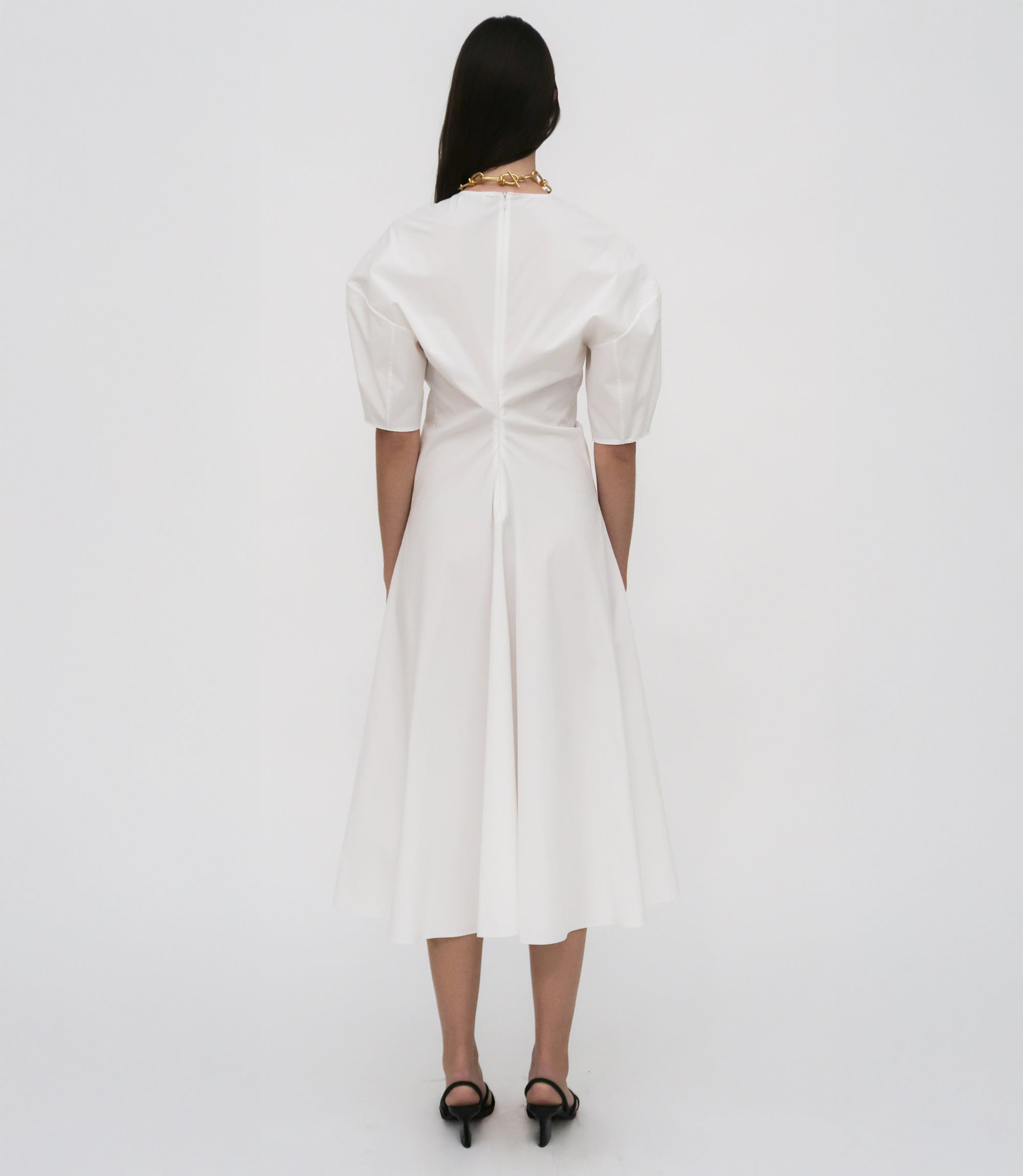 Intricate patternmaking shapes our Torqued Short-Sleeve Dress, cut in smooth Stretch Cotton Poplin to highlight its contours. Designed with a dramatic ruched waist and voluminous sleeves, it has a voluminous A-line skirt.
