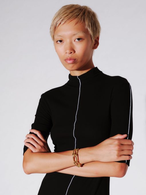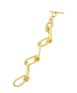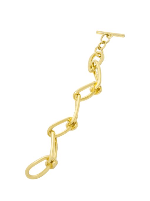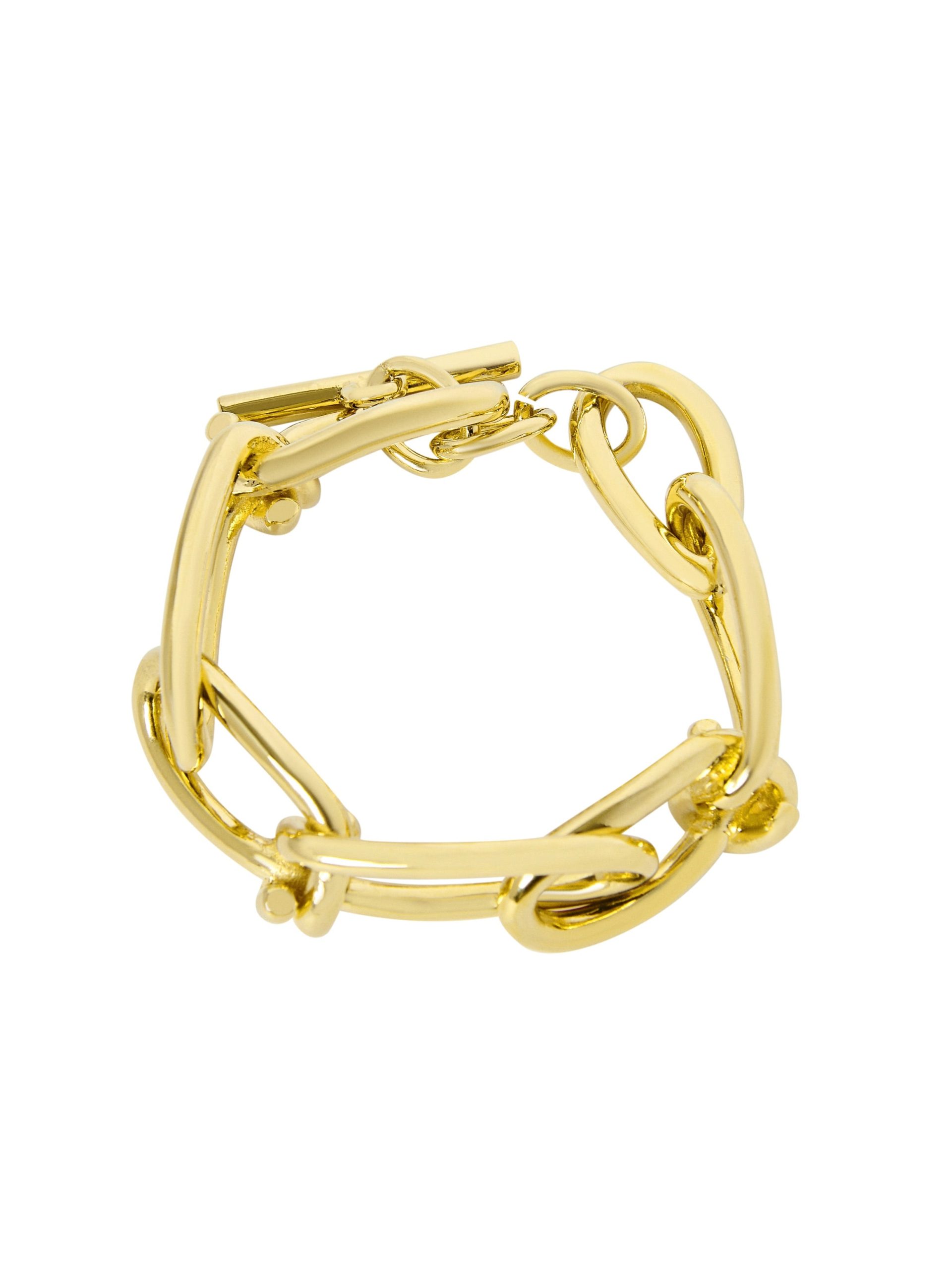 Rosetta Getty’s custom twisted chain bracelet is designed with radiant 14K gold plating. The durable brass necklace boasts glittery textural links and a bespoke toggle closure, engraved with a subtle Rosetta Getty signature.