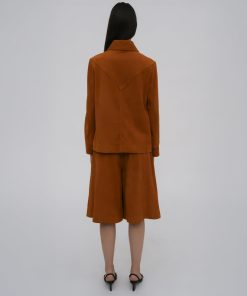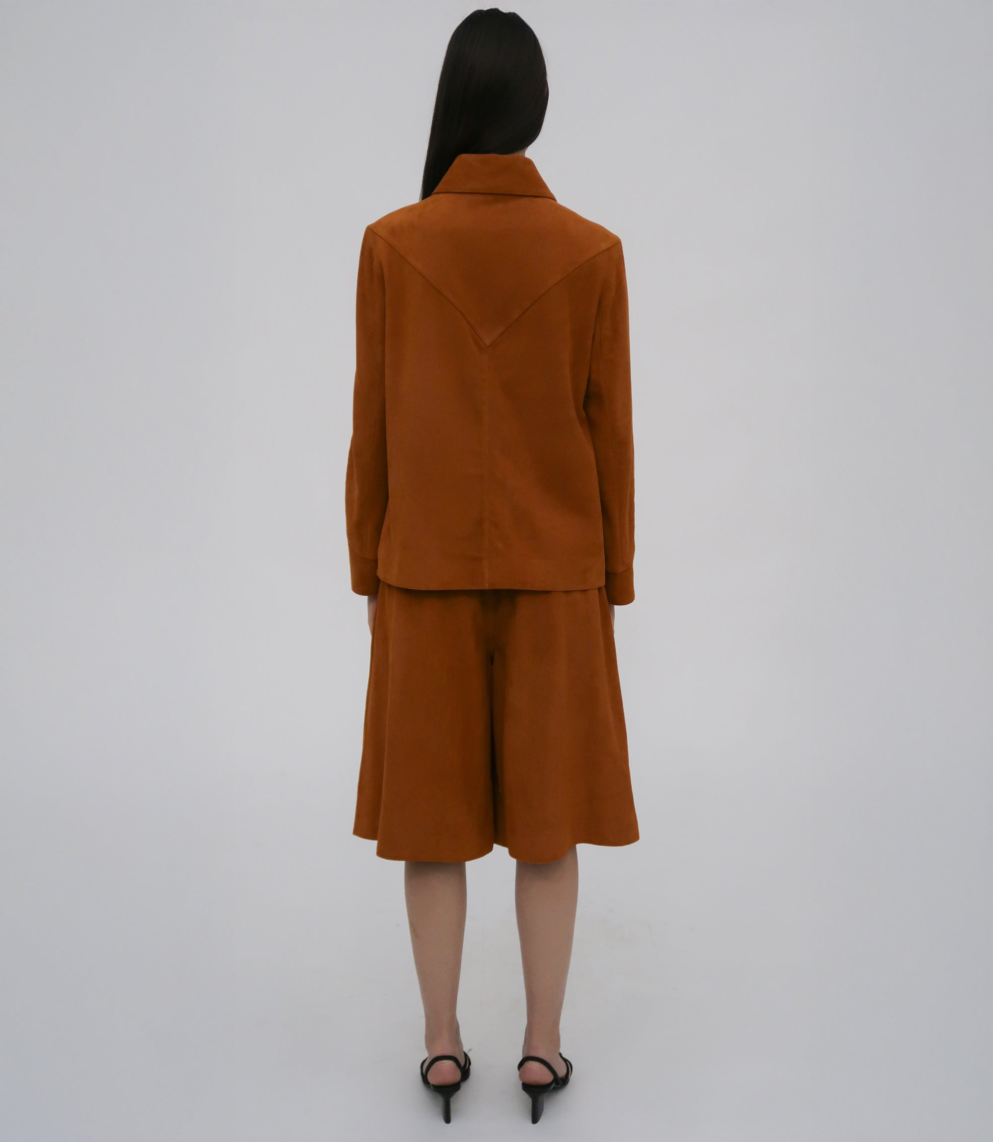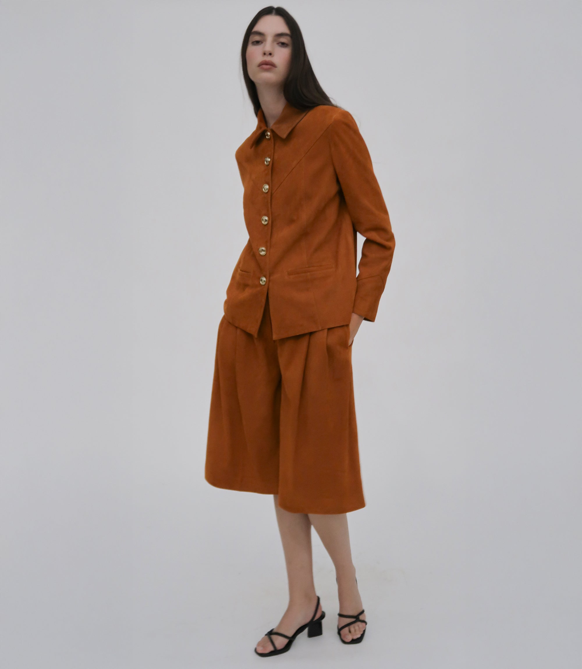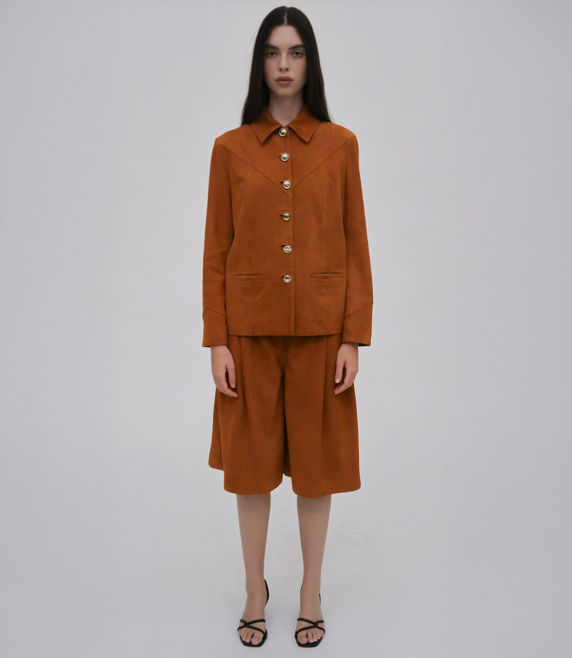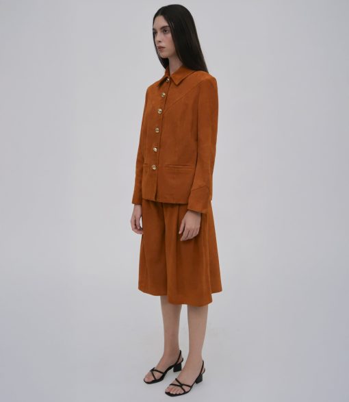 Lambskin Suede is a buttery-soft addition to Rosetta Getty’s Pre-Fall 25 fabric library. Cut in a refined Shirt Jacket and tailored Pleated Short, the material’s luxe texture elevates the set.