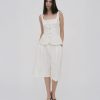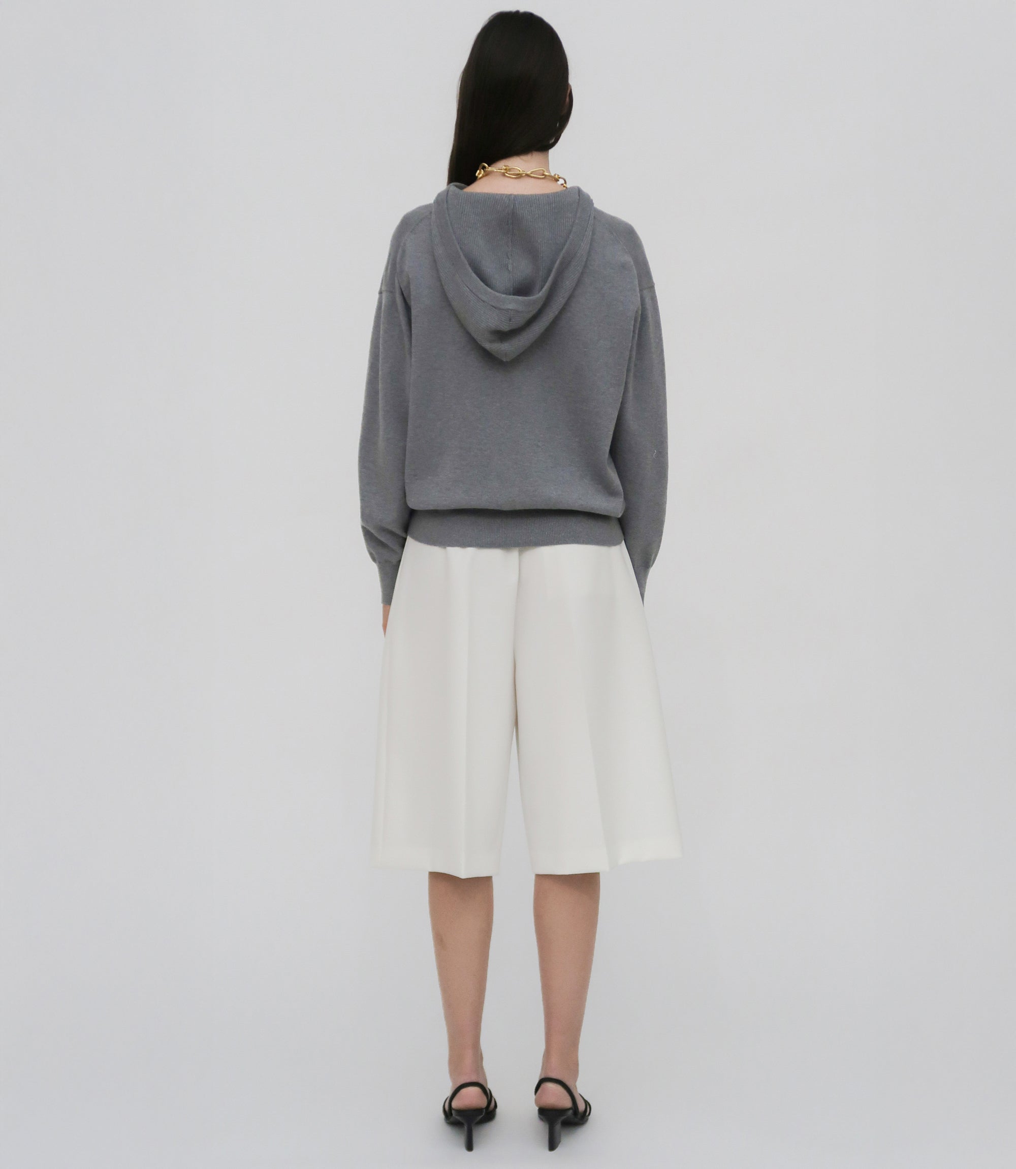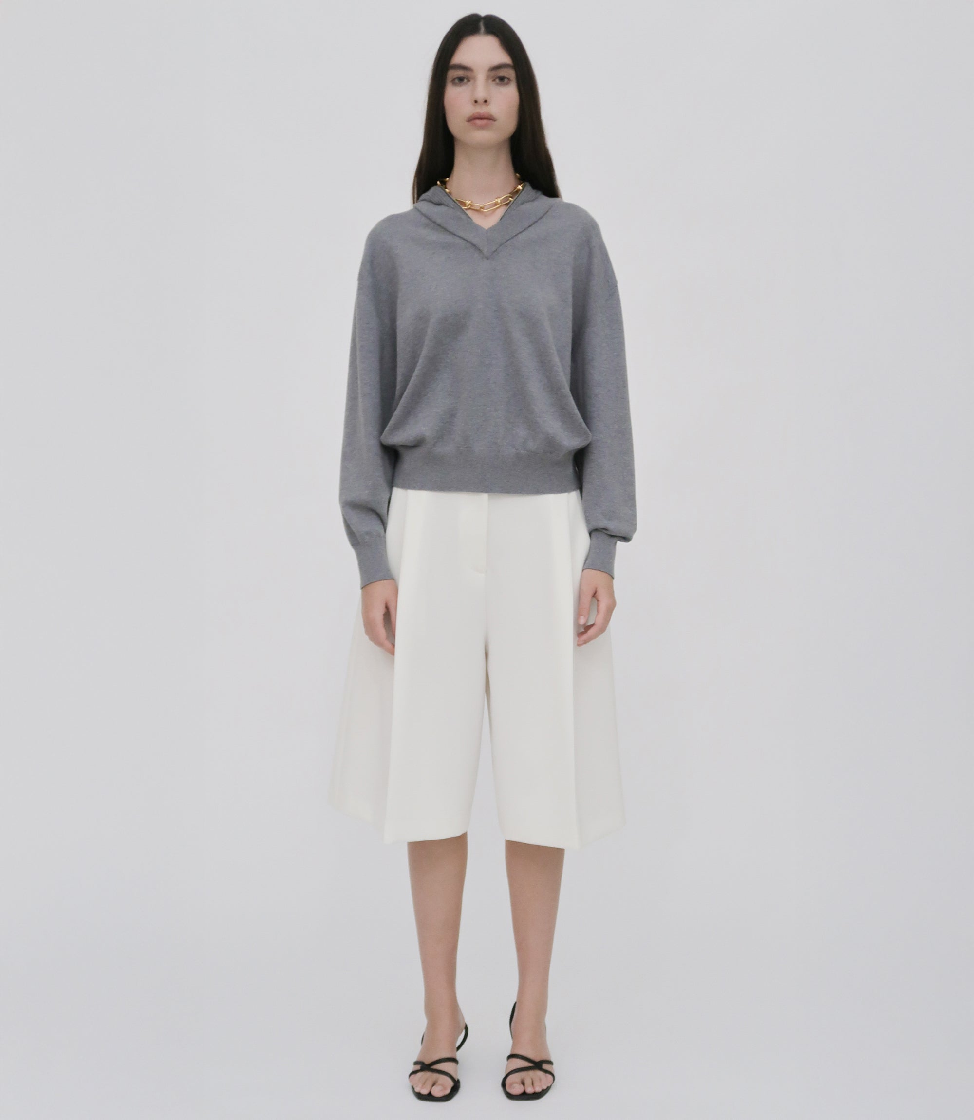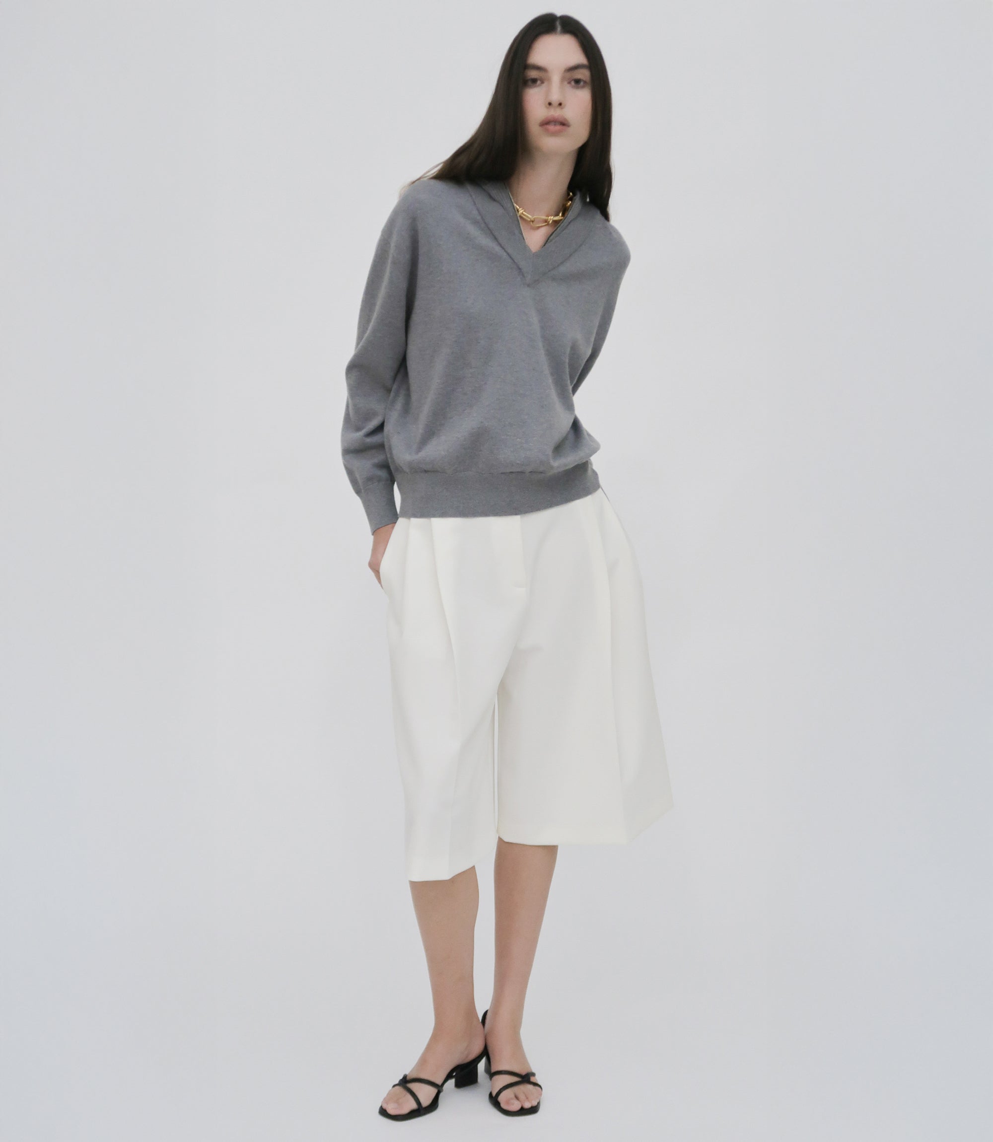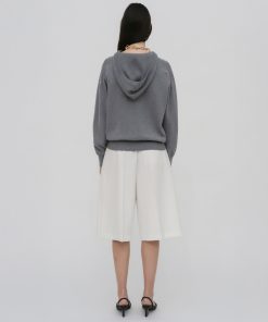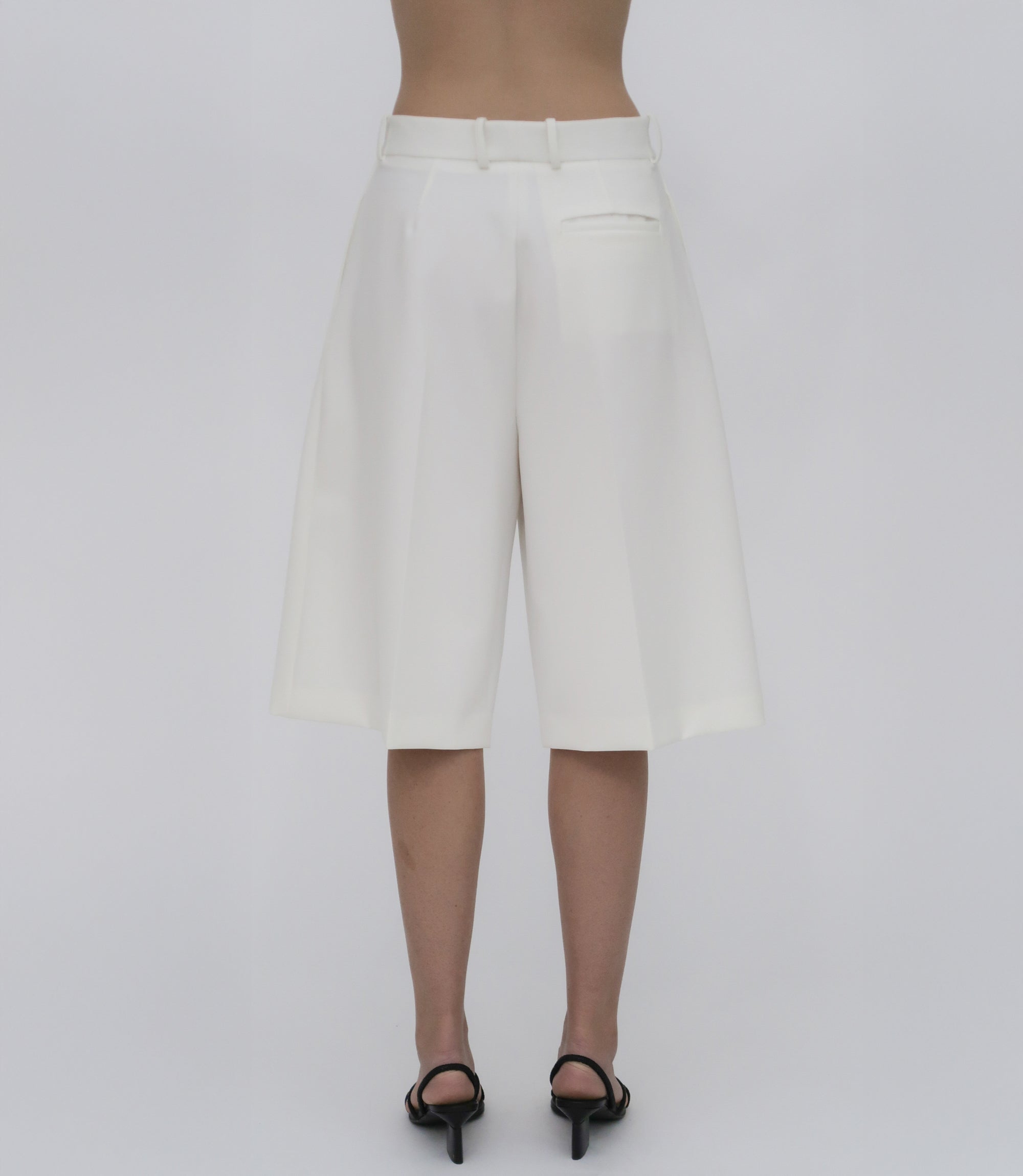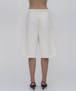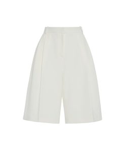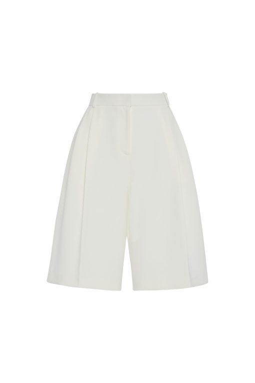Our seasonal short silhouette flows from waist to hem with a skirt-like effect. Shaped by an exaggerated front pleat, the Cady Suiting fabric has a utilitarian sensibility that is a perfect partner for the below-the-knee-length short.