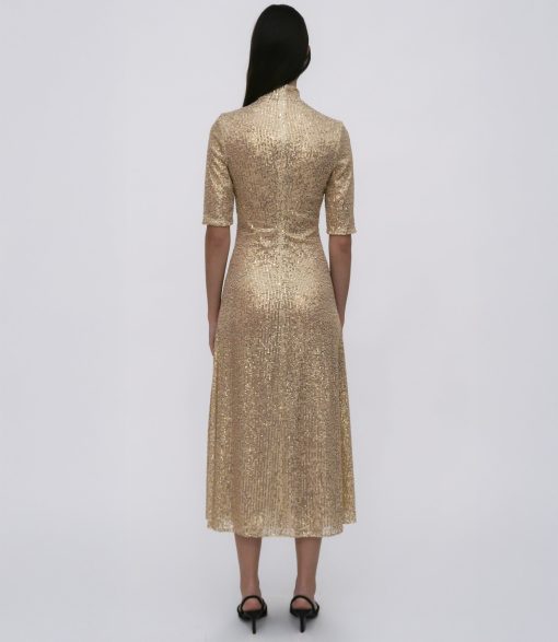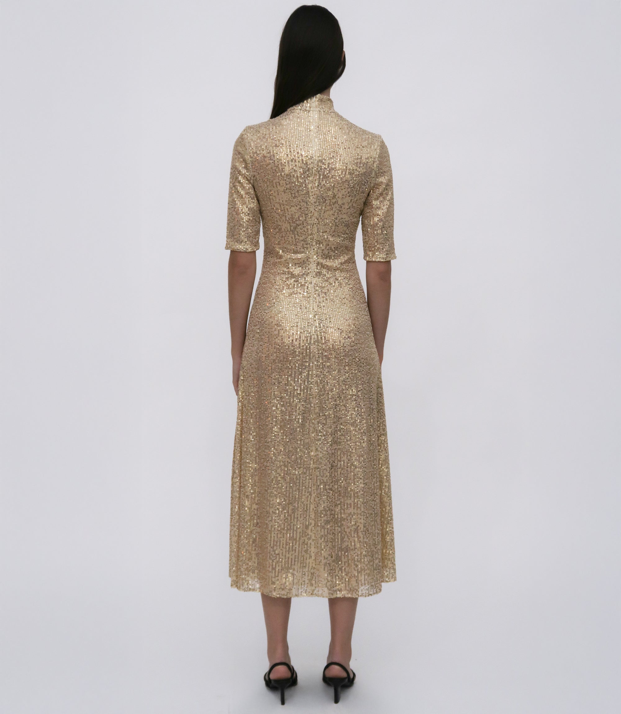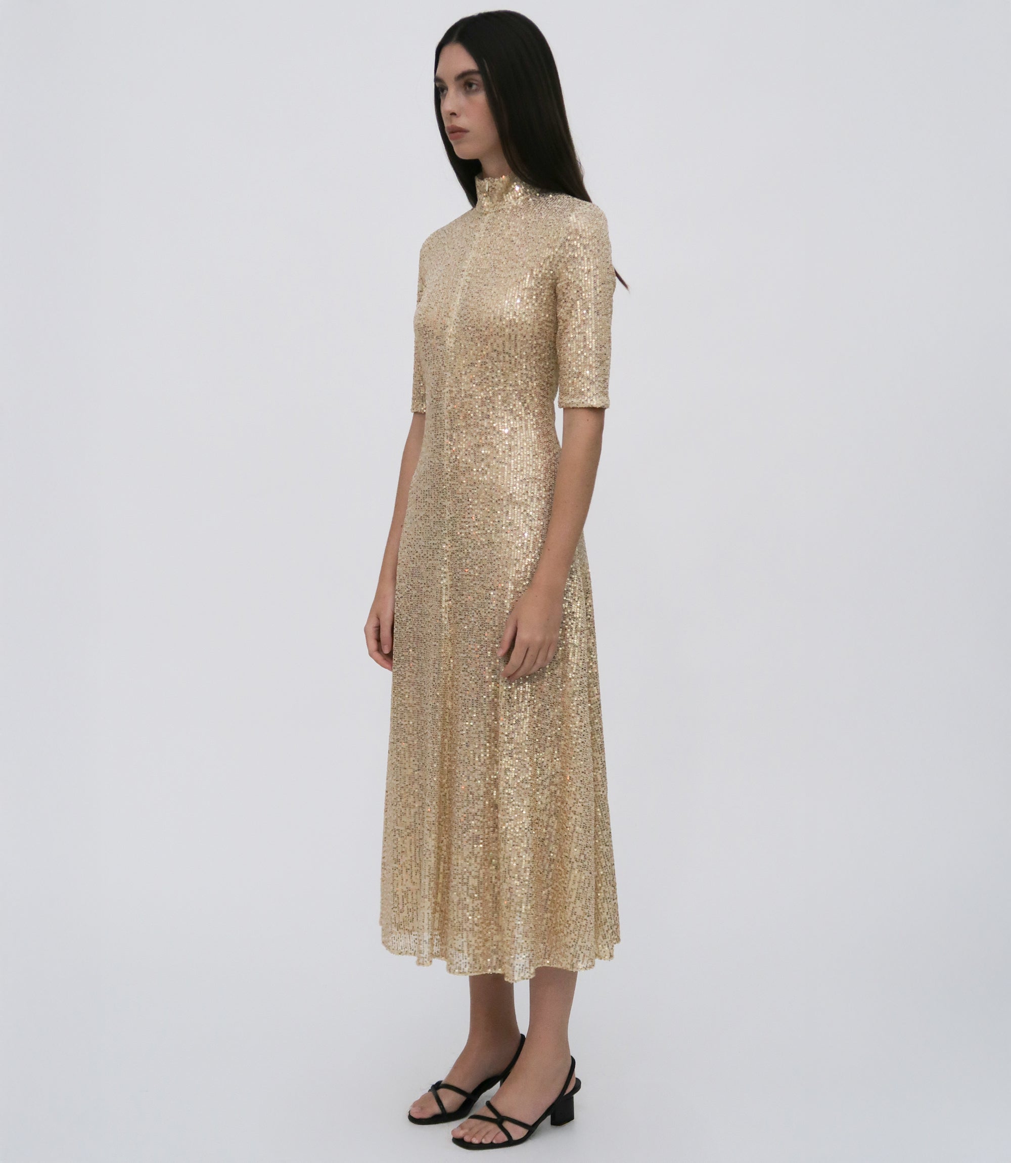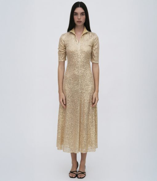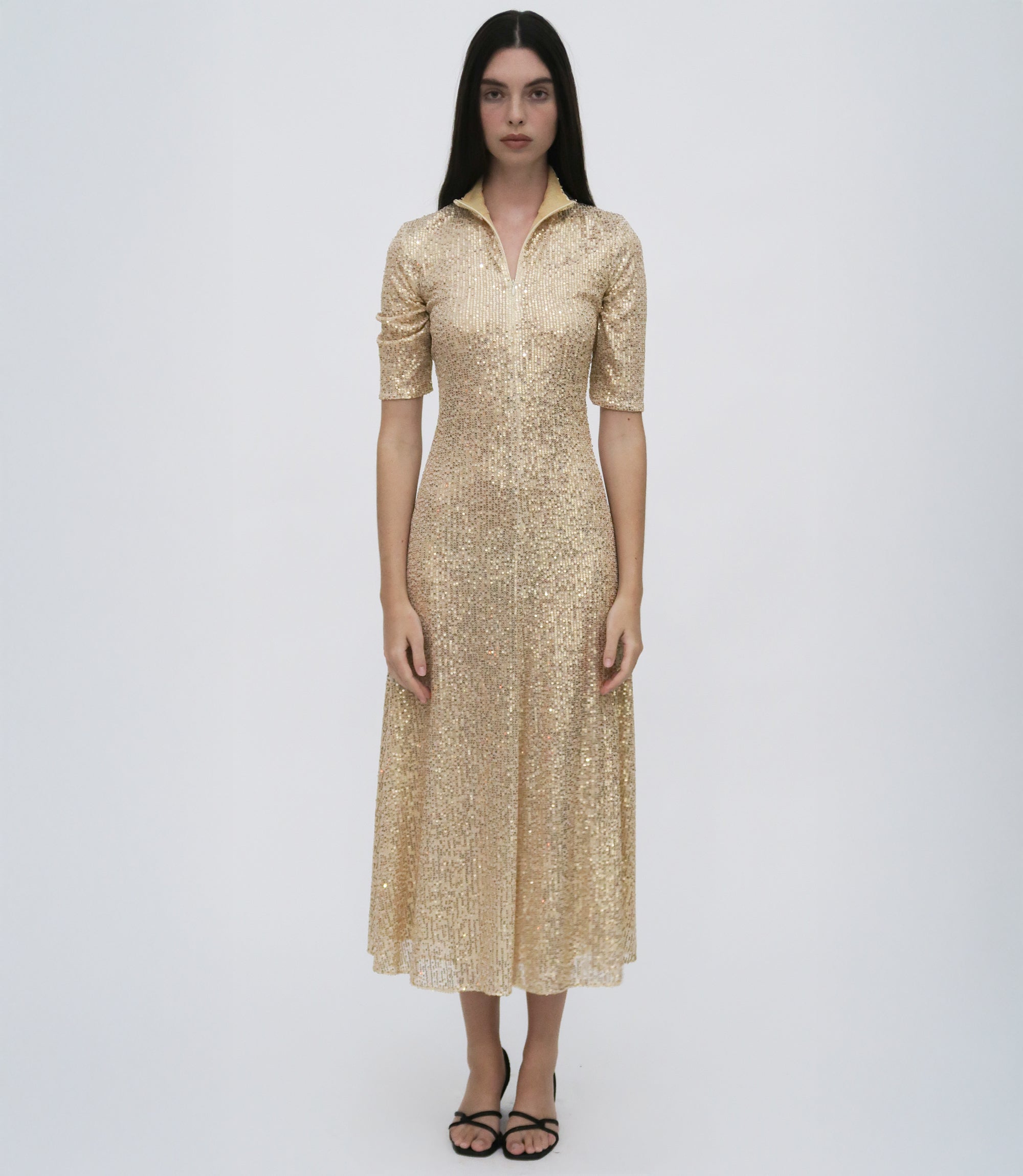 Pairing two signatures—the silhouette and the Sequin Mesh fabrication—the Zip-Up Midi Turtleneck Dress features for Pre-Fall 25 in a shorter midi length. Designed to hit above the ankle, it has a sense of movement amplified by the slightly sheer, high-shine fabric and can be worn open or closed with the adaptable front zip.